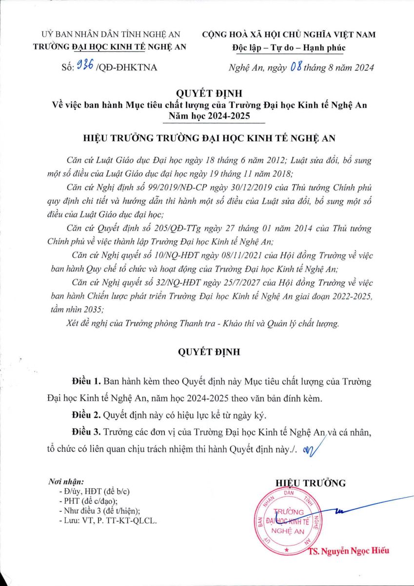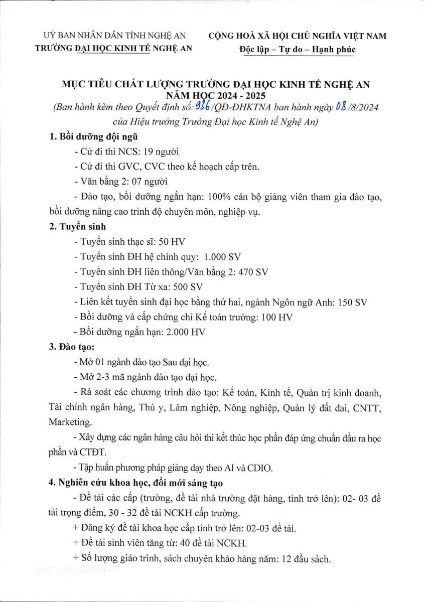 Mục tiêu chất lượng của Trường Đại học Kinh tế Nghệ An năm học 2024-2025 08/08/2024 10:40 2145 lượt xem