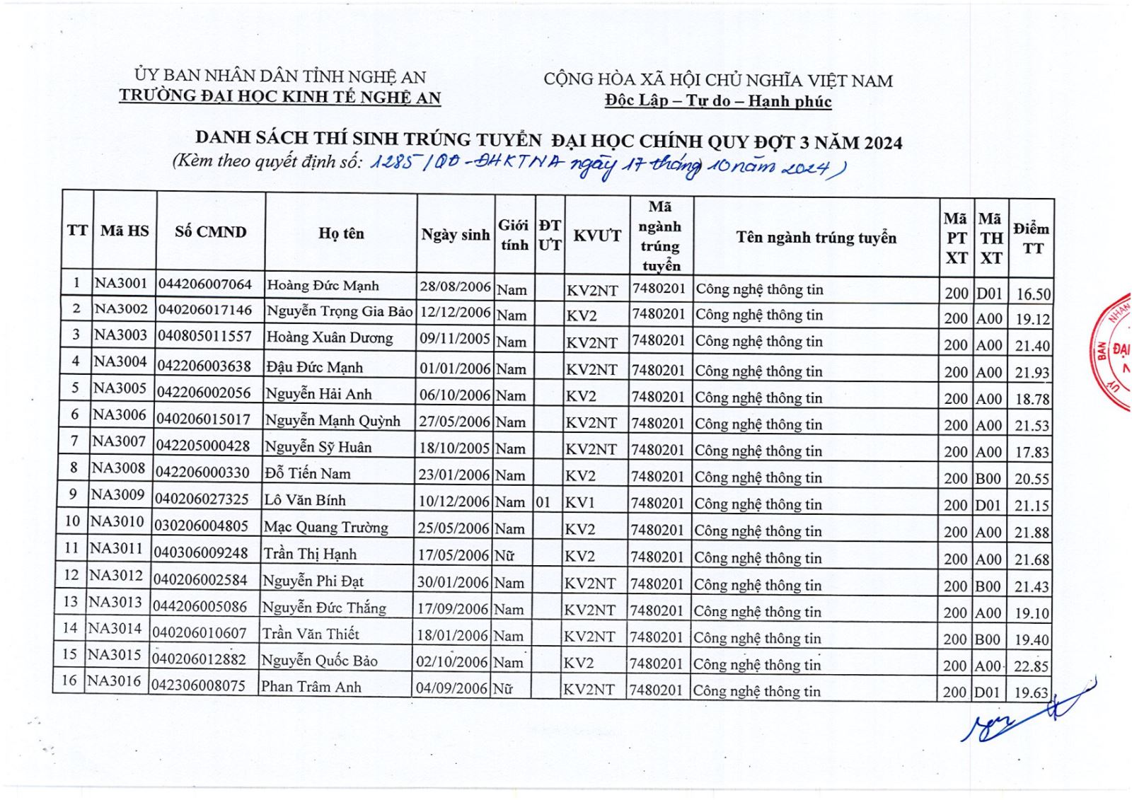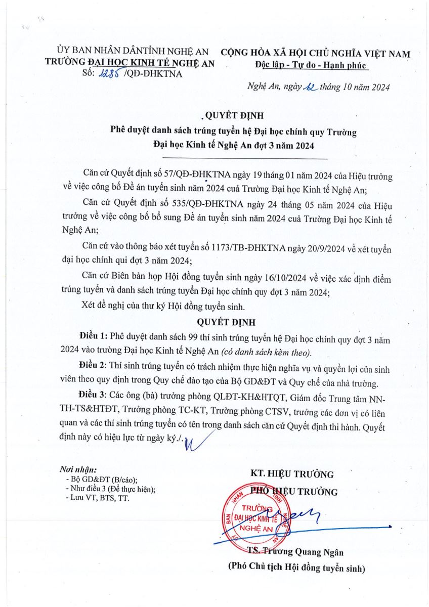 Quyết định phê duyệt danh sách trúng tuyển hệ Đại học chính quy đợt 3 năm 2024 12/10/2024 06:39 835 lượt xem