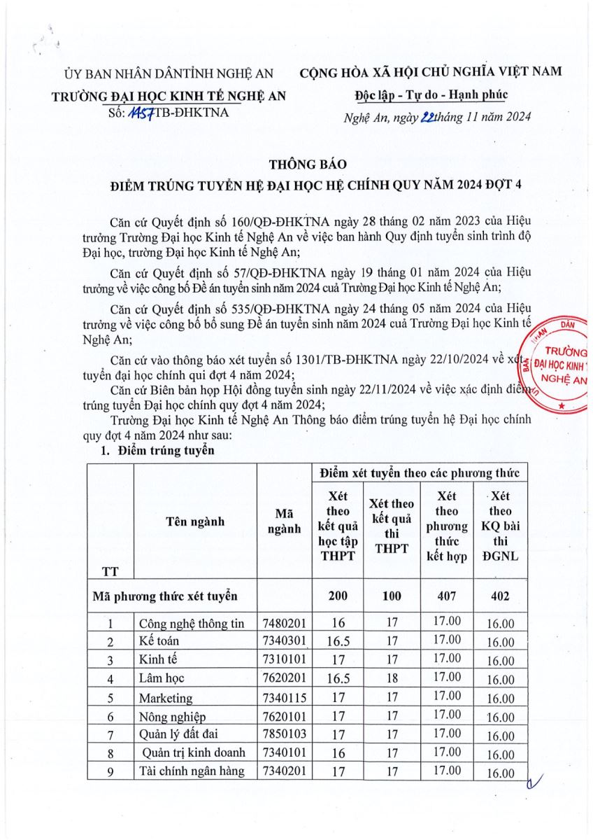 Thông báo Điểm trúng tuyển hệ đại học chính quy đợt 2 năm 2024