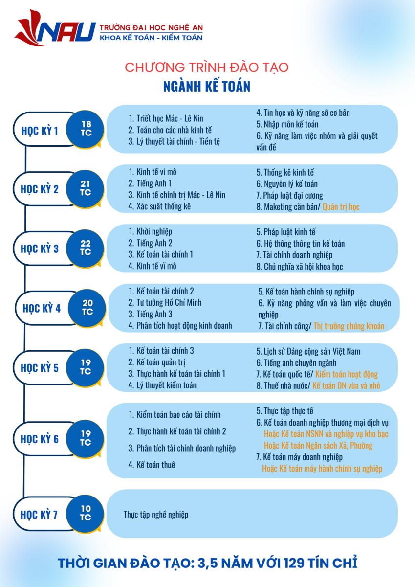 Chương trình đào tạo ngành Kế toán tại Trường Đại học Nghệ An là một chương trình hiện đại, linh hoạt, thực tiễn và định hướng hội nhập quốc tế, phù hợp với yêu cầu phát triển của nền kinh tế số. Sinh viên theo học tại đây không chỉ được trang bị kiến thức vững vàng mà còn có cơ hội phát triển toàn diện để trở thành những kế toán viên, kiểm toán viên, chuyên viên tài chính – những người giữ vai trò quan trọng trong mọi tổ chức, doanh nghiệp.