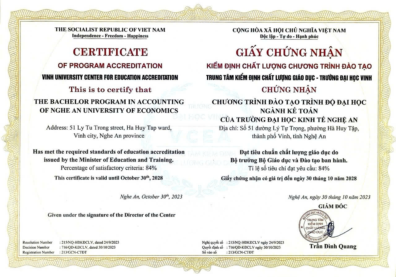 Chương trình đào tạo Ngành kế toán đã được kiểm định theo bộ tiêu chuẩn của Việt Nam - được xây dựng trên cơ sở bộ tiêu chuẩn của Mạng lưới đảm bảo chất lượng các trường đại học ASEAN.