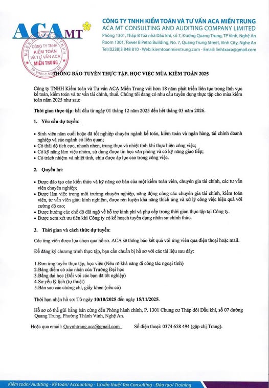 Công ty TNHH Kiểm toán và Tư vấn ACA Miền Trung với hơn 18 năm phát triển liên tục trong lĩnh vực kế toán, kiểm toán và tư vấn tài chính, thuế. Công ty đang có nhu cầu tuyển dụng thực tập cho mùa kiểm toán năm 2025 như sau: