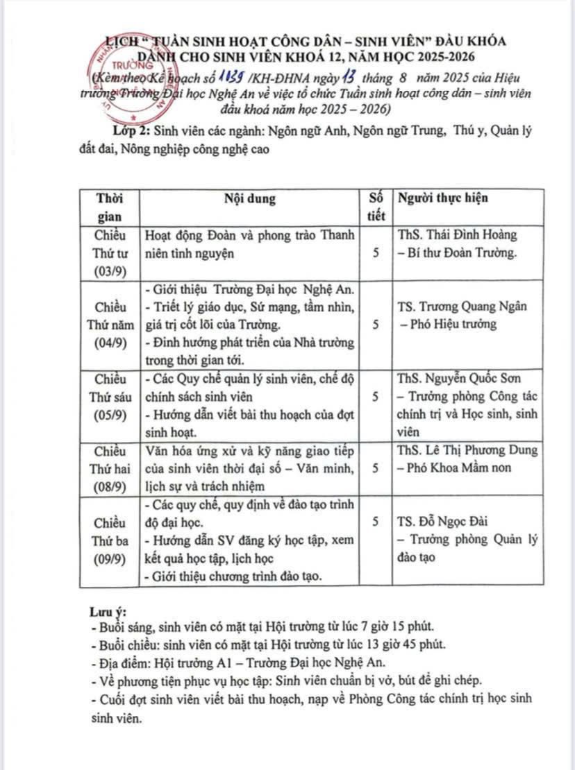📌 Thời gian: từ 03/9 đến 10/9/2025 (theo lịch cụ thể cho từng lớp/ngành)