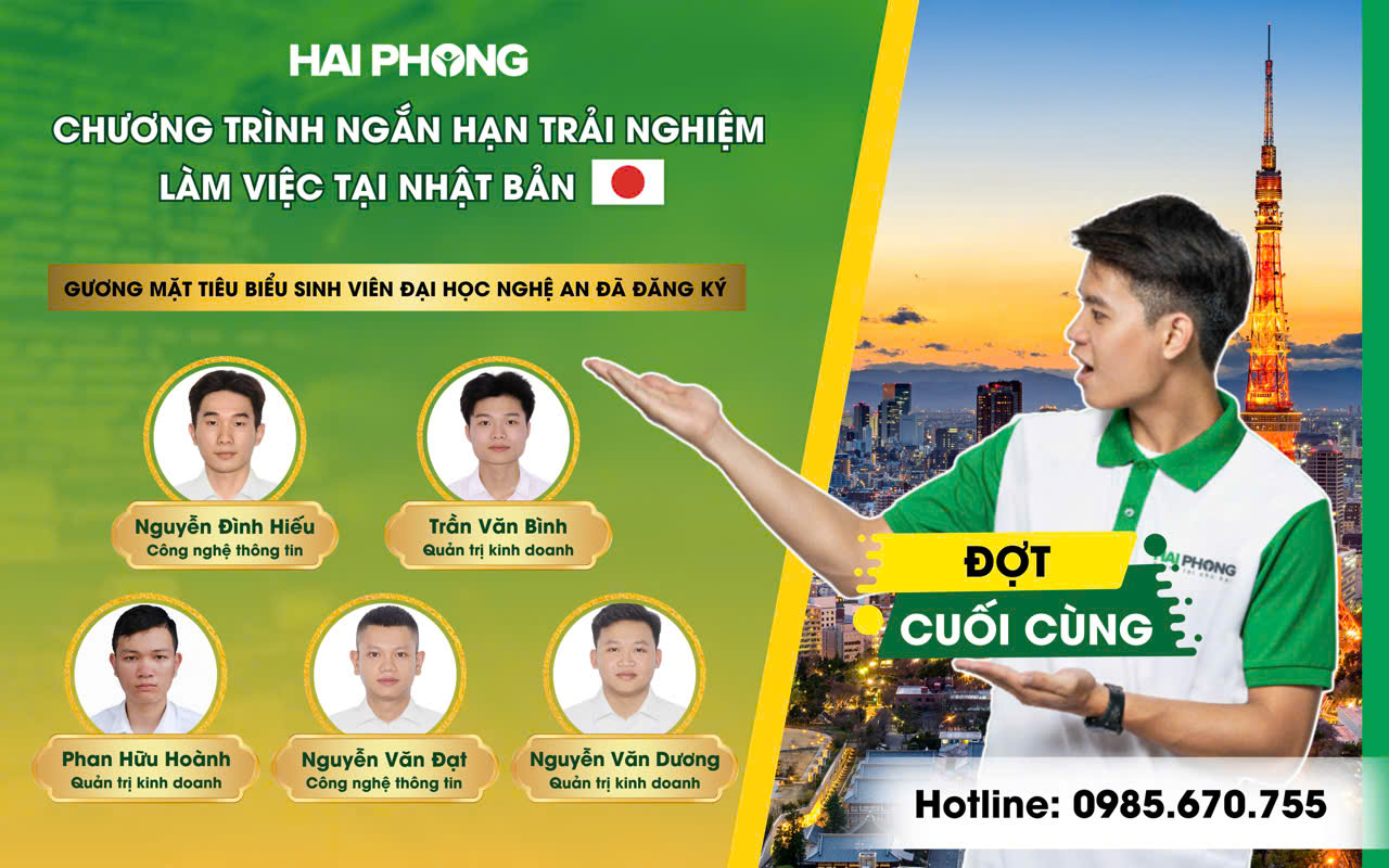 Sau thành công của các đợt tuyển trước, Công ty Hải Phong phối hợp cùng Trường Đại học Nghệ An chính thức mở đợt đăng ký cuối cùng cho Chương trình 12 tháng làm việc và trải nghiệm tại Nhật Bản! 🌏