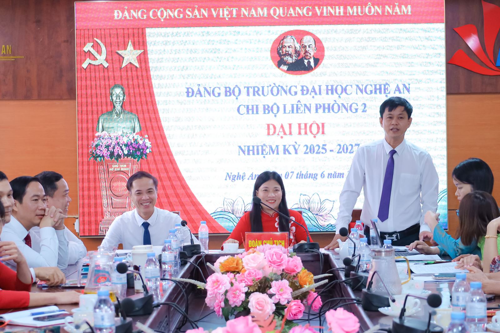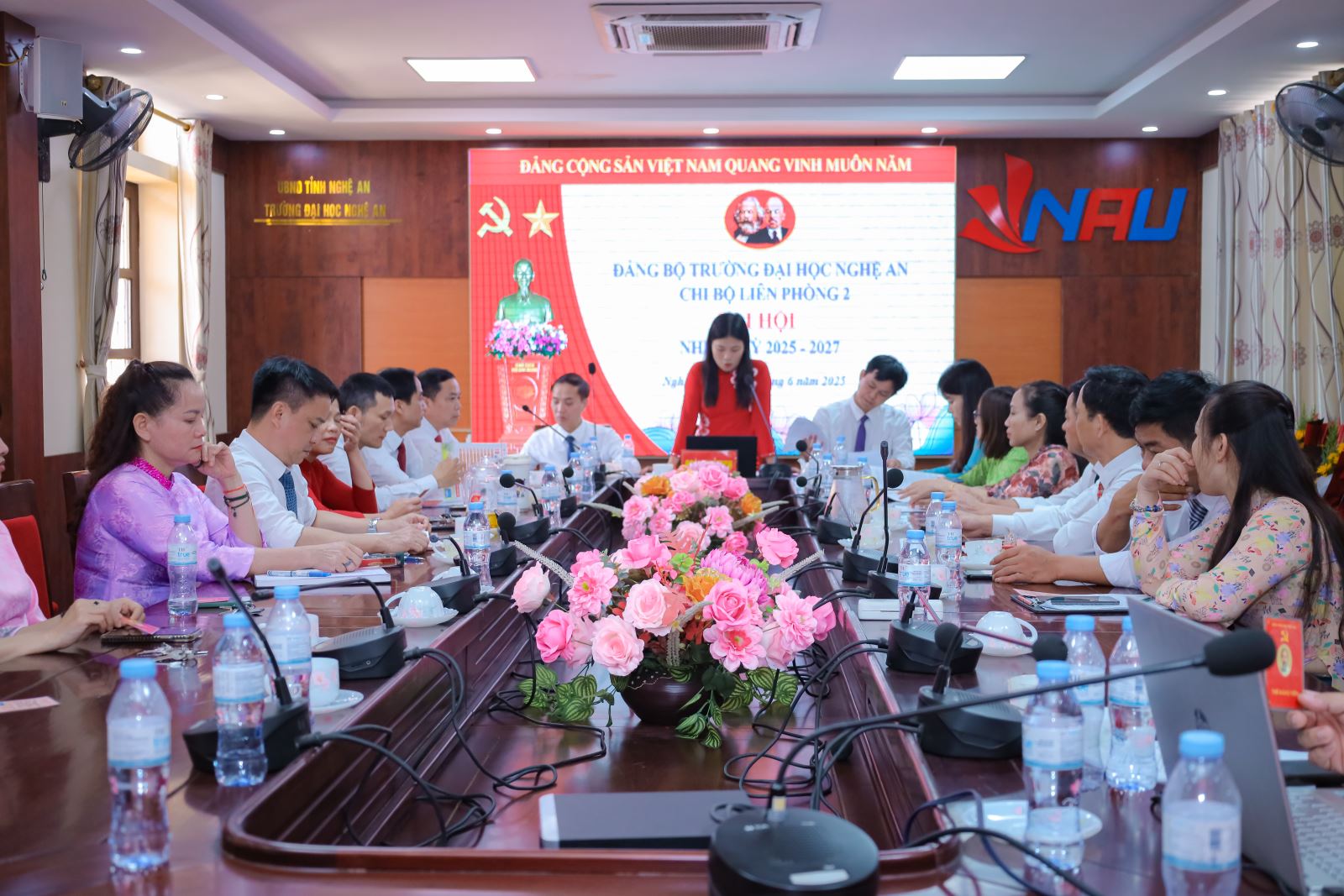 Sáng ngày 07 tháng 6 năm 2025, tại Phòng họp A1.2, Chi bộ Liên phòng 2 thuộc Đảng bộ Trường Đại học Nghệ An đã long trọng tổ chức Đại hội Chi bộ nhiệm kỳ 2025-2027. Đại hội là sự kiện chính trị quan trọng, tổng kết những thành quả đã đạt được trong nhiệm kỳ vừa qua và đề ra phương hướng, nhiệm vụ cho giai đoạn phát triển mới, đặc biệt trong bối cảnh sau sáp nhập các đơn vị.
