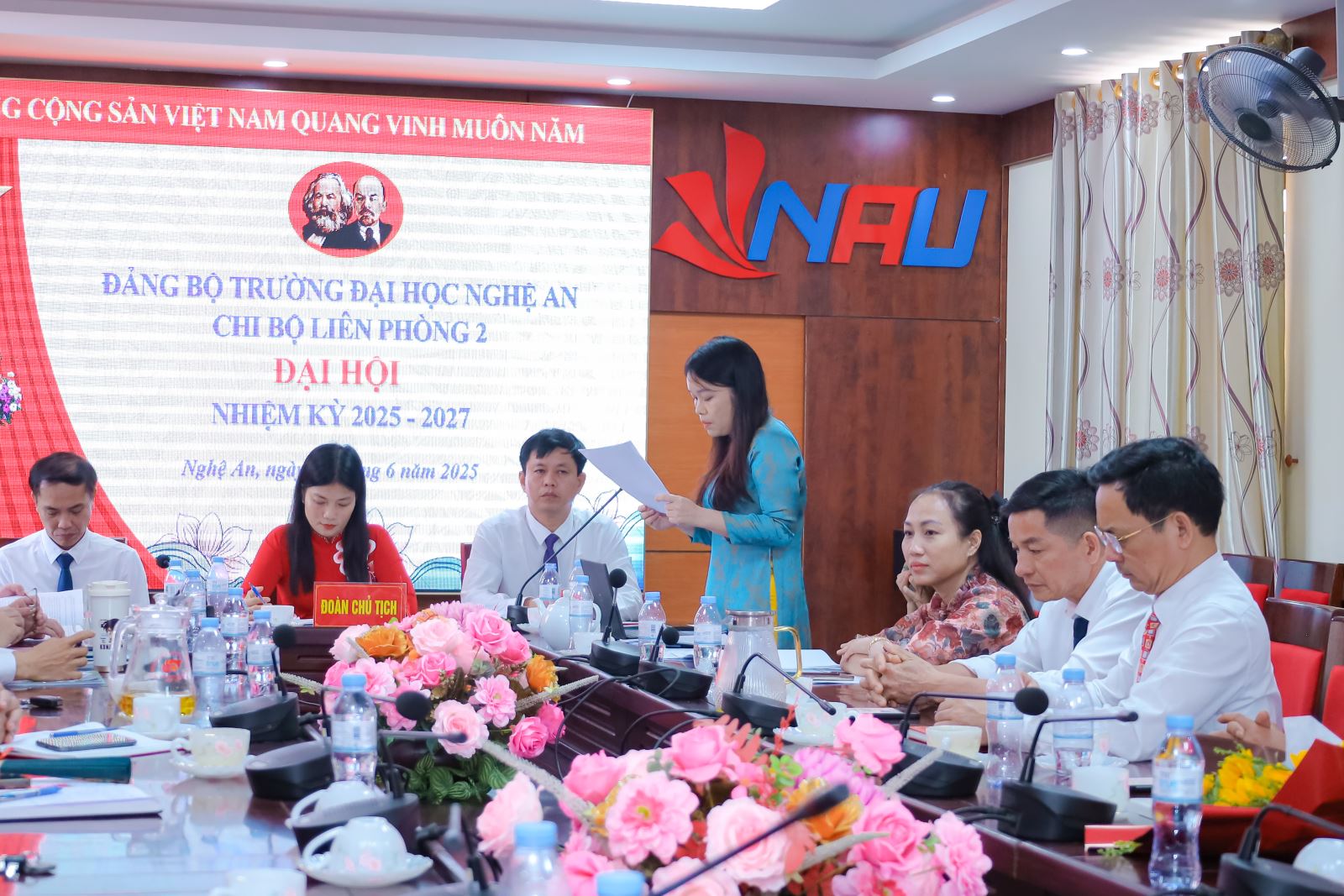 Đại hội cũng đã nghe Báo cáo kiểm điểm của Chi ủy do đồng chí Nguyễn Đình Hà trình bày, thể hiện tinh thần tự phê bình và phê bình nghiêm túc. Đặc biệt, Báo cáo tổng hợp ý kiến tham gia góp ý các dự thảo văn kiện Đại hội XIV của Đảng, Báo cáo chính trị trình Đại hội đại biểu Đảng bộ Ủy ban nhân dân tỉnh lần thứ I, Nghệ An nhiệm kỳ 2025 - 2030, đã cho thấy sự quan tâm và trách nhiệm của Chi bộ Liên phòng 2 đối với các vấn đề chung của Đảng và Tỉnh.