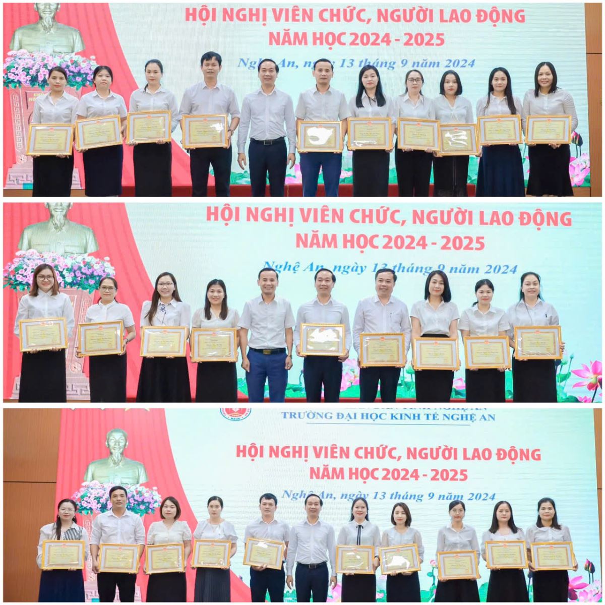 TS. Đặng Thị Thảo - Chủ tịch Công đoàn Trường Đại học Kinh tế Nghệ An, thừa uỷ quyền của Chủ tịch Liên đoàn Lao động tỉnh Nghệ An, trao Bằng khen vì sự nghiệp CĐ của Liên đoàn lao động tỉnh Nghệ An cho các công đoàn viên NAUE
