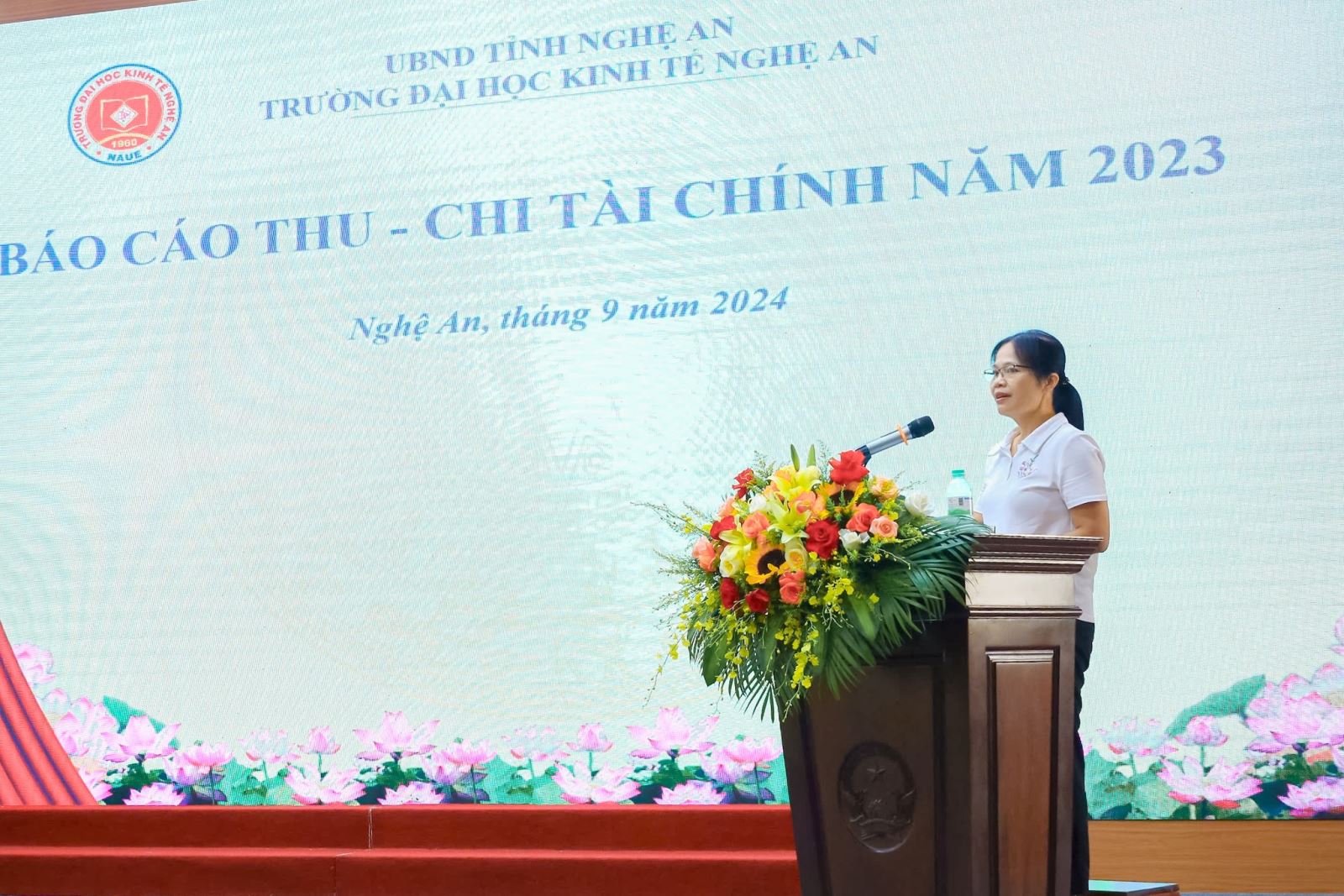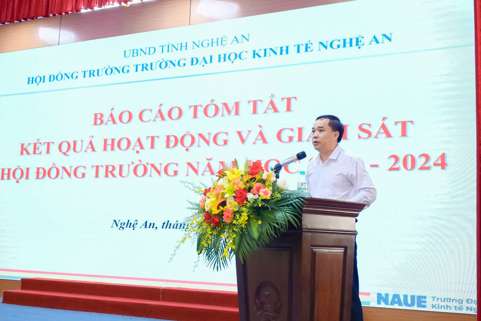 Tại Hội nghị, TS. Nguyễn Ngọc Hiếu cũng đã trình bày báo cáo Tổng kết công tác năm học 2023 - 2024 và phương hướng nhiệm vụ năm học 2024 - 2025. Theo đó, năm học 2023 - 2024 Trường Đại học Kinh tế Nghệ An đã hoàn thành tốt các nhiệm vụ trong năm học, trong đó có công tác tuyển sinh - đào tạo, hoạt động khoa học công nghệ, hợp tác quốc tế, khảo thí và đảm bảo chất lượng, quản lý sinh viên, hoạt động đoàn thể... Nhằm phát huy những kết quả đã đạt được và khắc phục những hạn chế trong năm học 2023 - 2024, Nhà trường đã đề ra phương hướng, mục tiêu cụ thể và các nhiệm vụ chủ yếu về công tác chính trị - tư tưởng, quản trị trường đại học, Hội đồng trường; công tác tuyển sinh, đào tạo, nghiên cứu khoa học, hợp tác quốc tế, quản lý chất lượng, công tác tổ chức cán bộ, công tác thanh tra, pháp chế, thi đua khen thưởng, công tác tài chính, công tác quản lý sinh viên và một số công tác khác trong năm học 2024 - 2025.