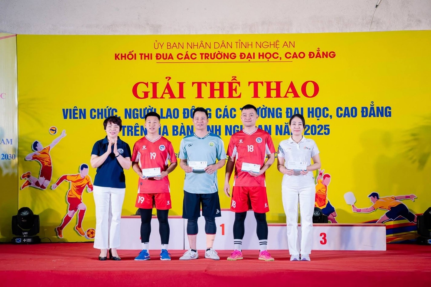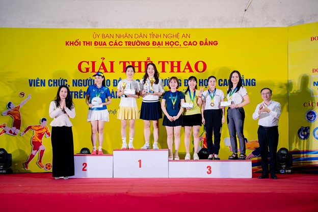 Sau gần 1 tuần thi đấu nhiệt tình, cống hiến hết mình, đoàn thể thao trường Đại học Nghệ An đã khép lại hành trình tại Giải thể thao Cán bộ, Viên chức, Người lao động (CBVCNLĐ) các trường Cao đẳng, Đại học thuộc Khối thi đua tỉnh Nghệ An năm 2025. Đoàn vận động viên của nhà trường đã tham gia tranh tài ở nhiều nội dung thế mạnh và để lại dấu ấn đậm nét với những kết quả rực rỡ: Giải Ba toàn đoàn: Giải Nhì Pickleball đôi Nữ dưới 40 tuổ; Giải phong cách Bóng đá Nam; Giải Ba Pickleball đôi Nữ trên 40 tuổi.