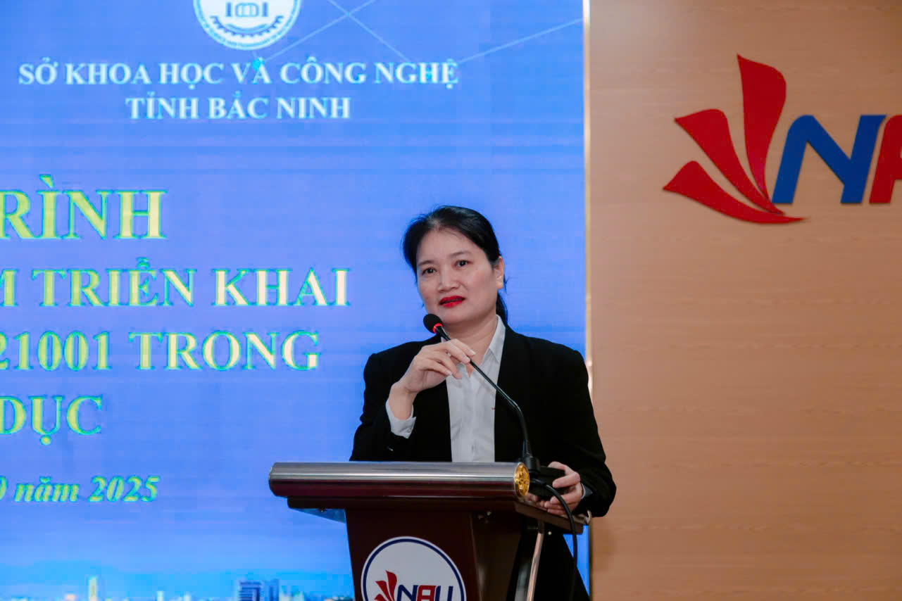 Với vai trò là đơn vị đầu mối triển khai Bộ tiêu chuẩn ISO 21001:2018 tại trường, Thạc sĩ Đinh Thị Thu Hương – Trưởng phòng Thanh tra, Khảo thí và Đảm bảo chất lượng đã khái quát nội dung cốt lõi của Bộ tiêu chuẩn, đồng thời chia sẻ kinh nghiệm thực tiễn, những thuận lợi và khó khăn trong quá trình áp dụng tại Trường Đại học Nghệ An. Yếu tố con người, kế hoạch triển khai, nguồn kinh phí, cùng việc xây dựng bộ quy trình, sổ tay chất lượng, xác định mục tiêu và kiểm định mục tiêu chất lượng, công tác đánh giá nội bộ... đều đóng vai trò then chốt trong việc vận hành hiệu quả hệ thống quản lý chất lượng giáo dục theo tiêu chuẩn ISO 21001:2018. Giấy chứng nhận ISO 21001:2018 có giá trị trong 3 năm và được giám sát, đánh giá định kỳ hằng năm. Vì vậy, việc duy trì và cải tiến liên tục sau mỗi lần đánh giá là yếu tố quan trọng để nâng cao hiệu quả hệ thống quản lý chất lượng của Trường Đại học Nghệ An.