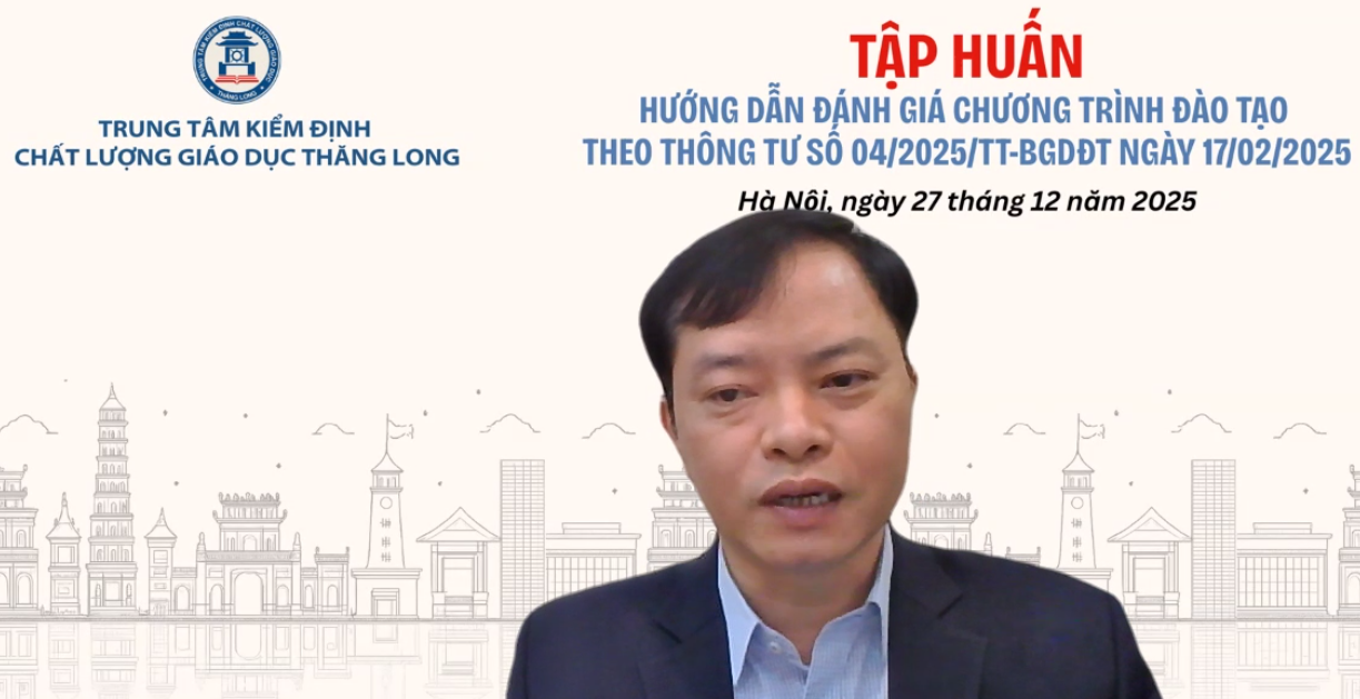 Tiếp đến, TS. Nguyễn Văn Đường – Giám đốc Trung tâm Kiểm định chất lượng giáo dục Thăng Long đã giới thiệu khái quát Tài liệu hướng dẫn đánh giá theo bộ tiêu chuẩn kiểm định chất lượng chương trình đào tạo các trình độ của giáo dục đại học ban hành kèm theo Thông tư số 04/2025/TT-BGDĐT.