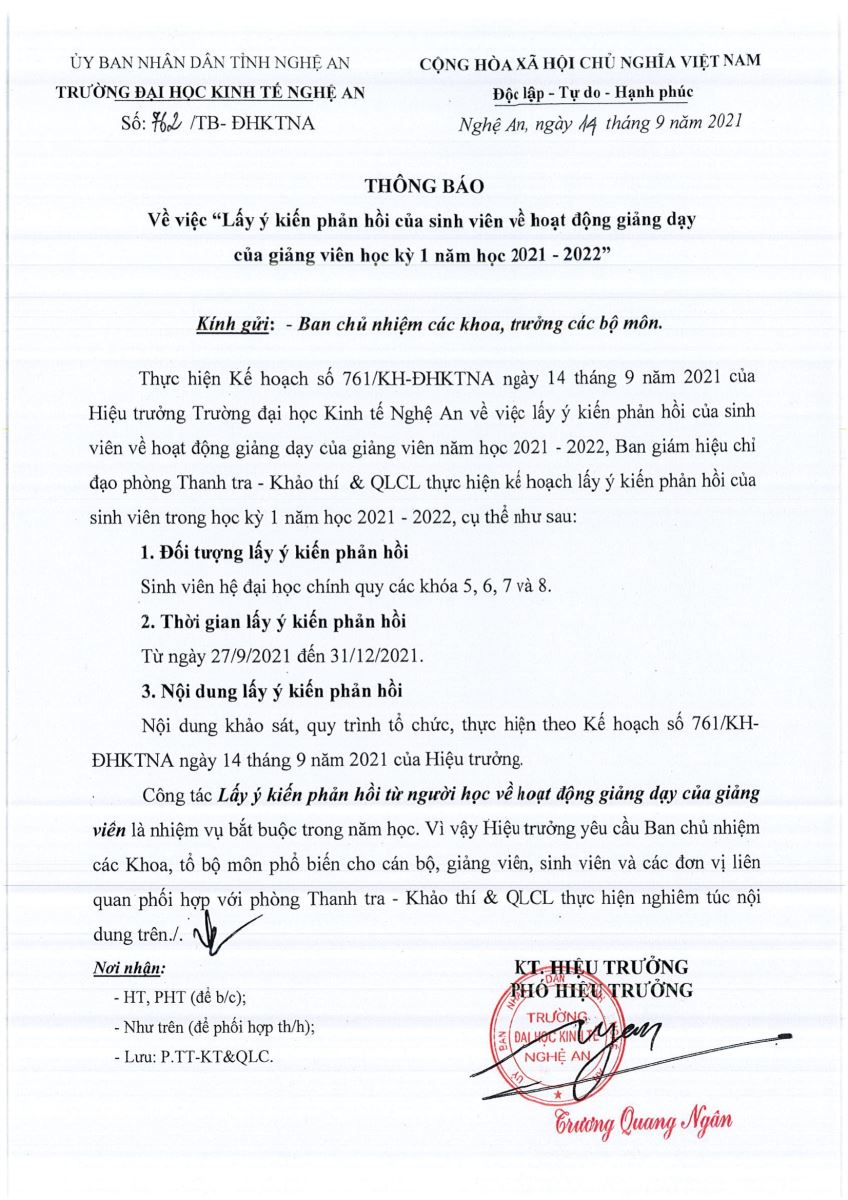 Thông báo về việc lấy ý kiến phản hồi của sinh viên về hoạt động giảng dạy của giảng viên học kỳ 1 năm học 2021-2022 21/09/2021 10:45 5959 lượt xem