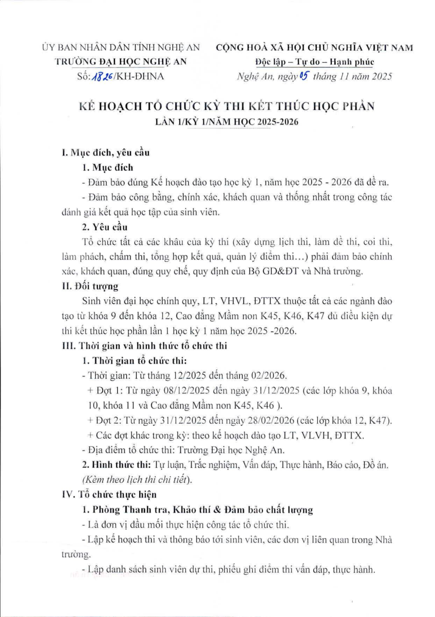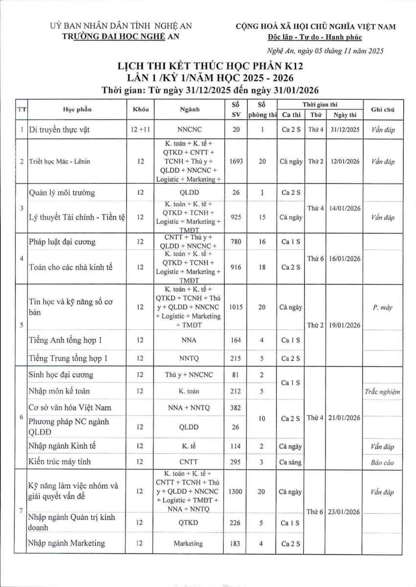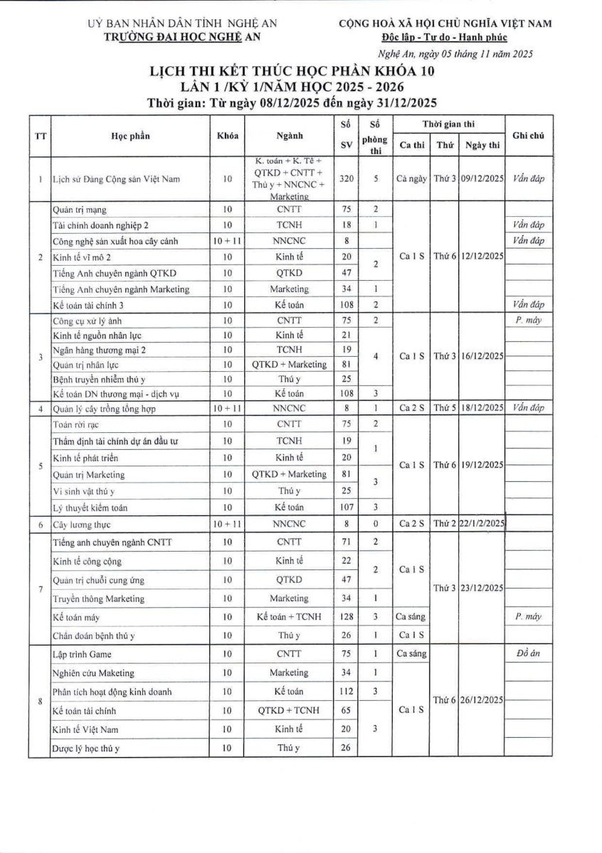 Lịch thi HK1 2025-2026 hệ Liên thông, Văn bằng 2, Vừa học vừa làm