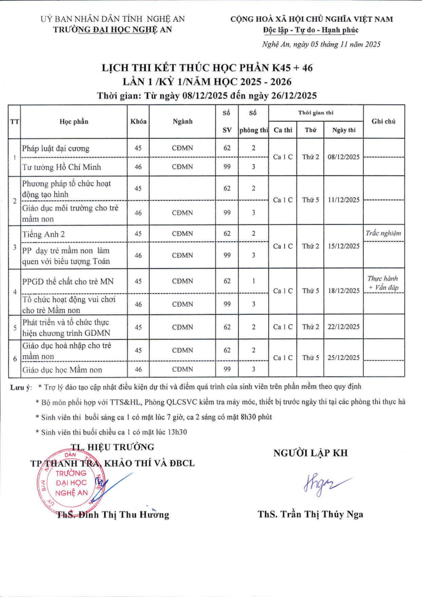 Lịch thi kết thúc học phần Khóa 44 + 46 Cao đẳng mầm non, kỳ phụ và lần 2, năm học 2024-2025