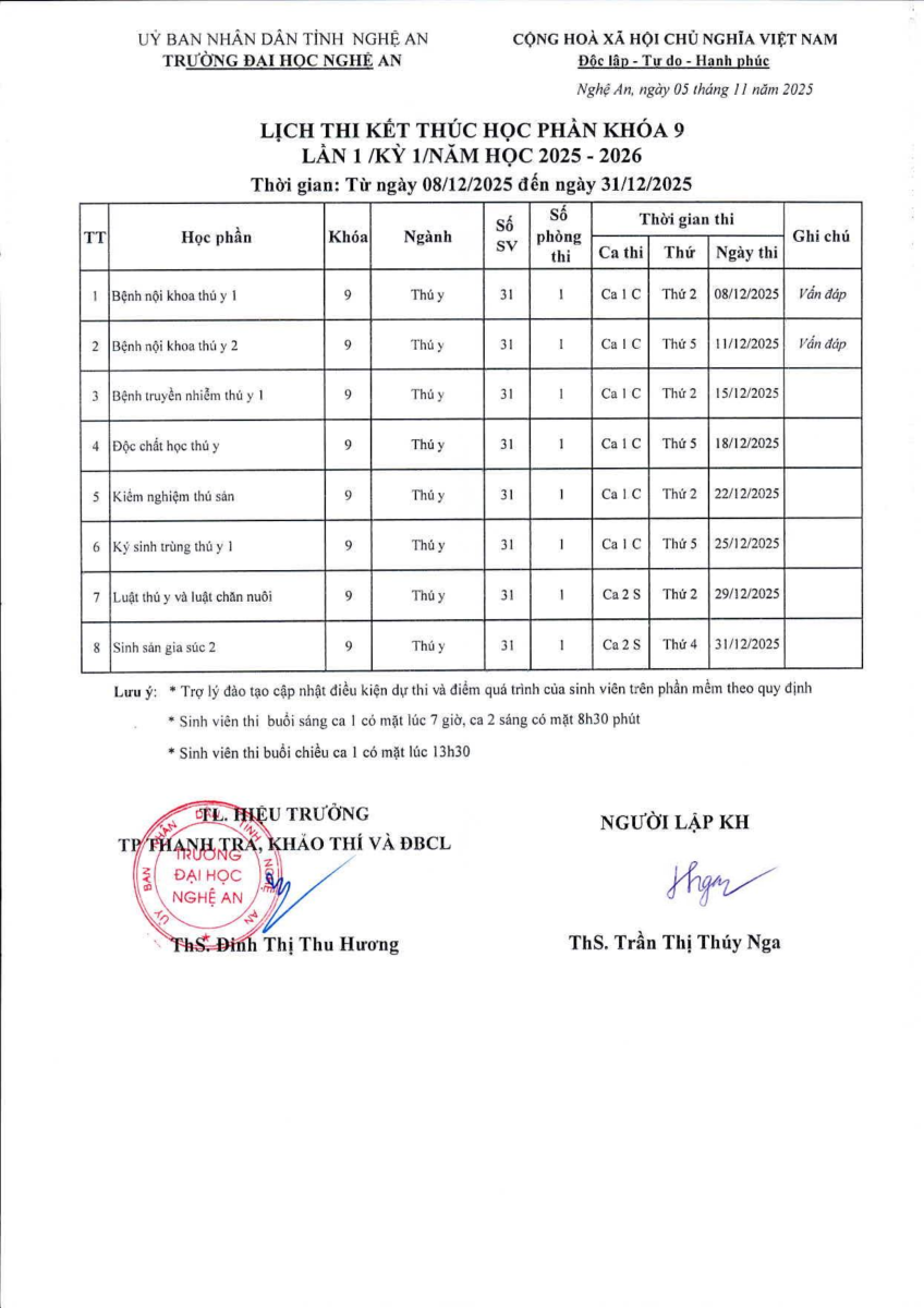 Lịch thi kết thúc học phần Khóa 9 học lại và lần 2, kỳ 2, năm học 2024-2025