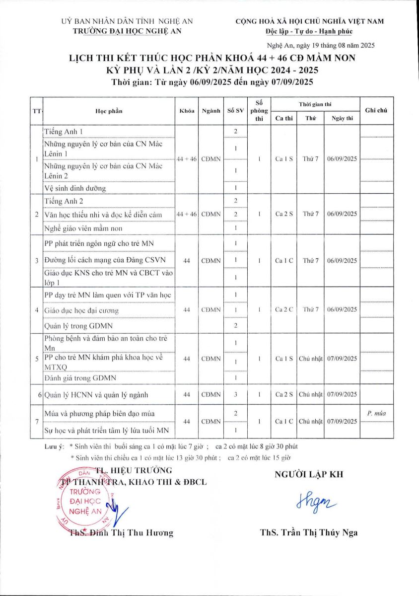 Lịch thi kết thúc học phần Khóa 44 + 46 Cao đẳng mầm non, kỳ phụ và lần 2, năm học 2024-2025 19/08/2025 09:32 3367 lượt xem