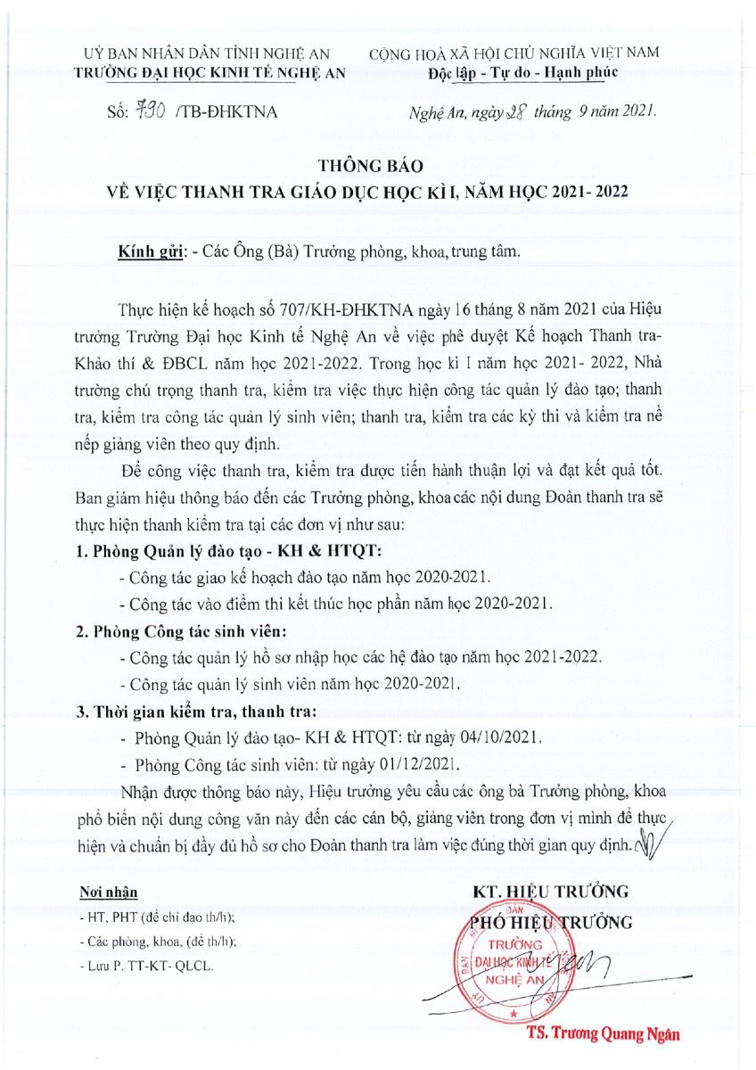 Thông báo về việc thanh tra giáo dục học kỳ 2 năm học 2020-2021