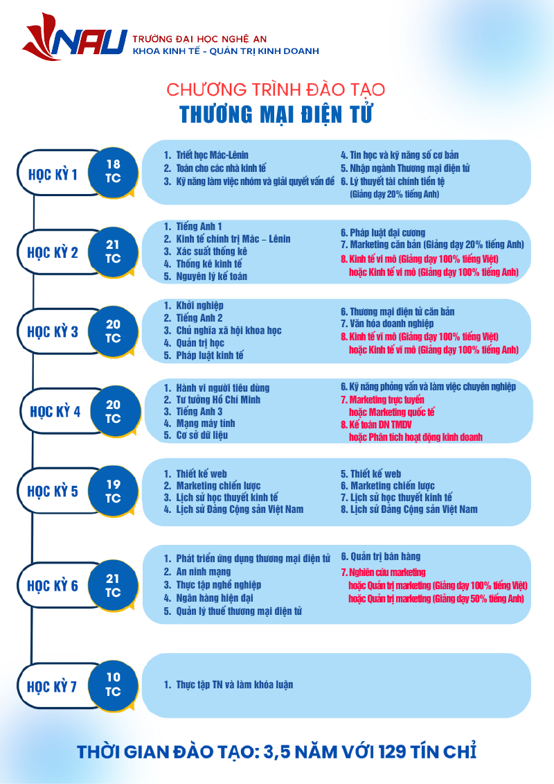Chương trình đào tạo (CTĐT) ngành Thương mại Điện tử tại Trường Đại học Nghệ An được thiết kế theo định hướng ứng dụng, tuân thủ nghiêm ngặt quy định của Bộ Giáo dục và Đào tạo. Với thời gian đào tạo chuẩn là 3,5 năm (tương đương 7 kỳ học) và tổng số 129 tín chỉ (chưa bao gồm các học phần Giáo dục thể chất và Giáo dục quốc phòng), chương trình này cung cấp một nền tảng vững chắc và linh hoạt, đáp ứng nhu cầu phát triển không ngừng của nền kinh tế số.