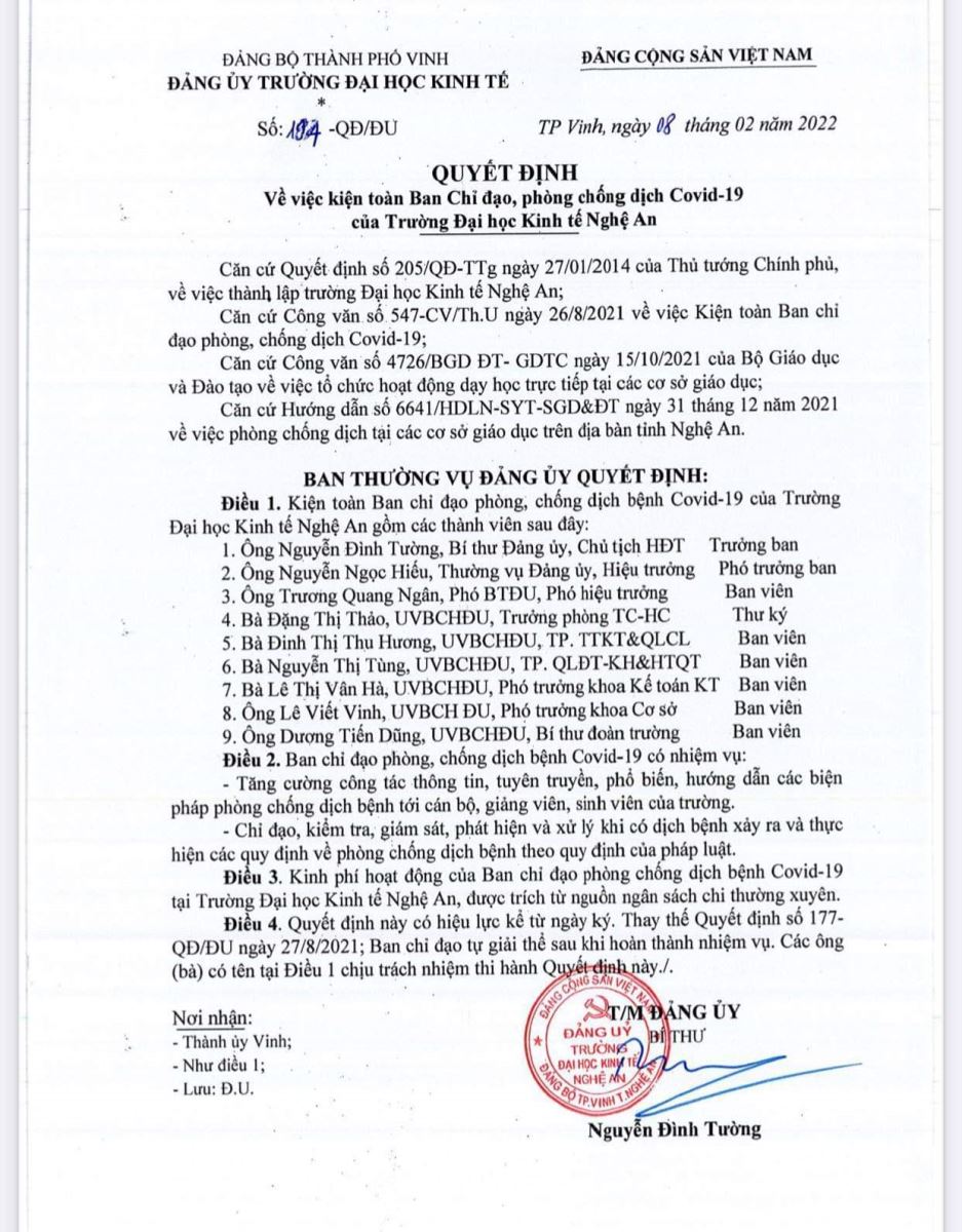 Quyết định về việc kiện toàn Ban Chỉ đạo, phòng chống dịch Covid-19 của Trường Đại học Kinh tế Nghệ An 10/02/2022 05:02 5381 lượt xem