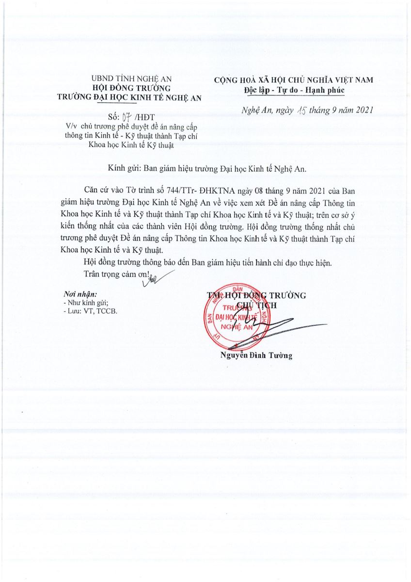 Công văn chủ trương phê duyệt đề án nâng cấp Thông tin Kinh tế và Kỹ thuật thành Tạp chí khoa học Kinh tế và Kỹ thuật 06/10/2021 10:50 5159 lượt xem