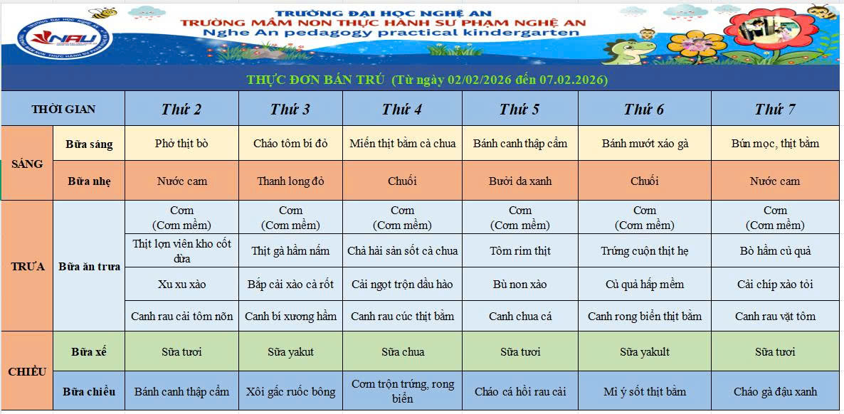 Thực đơn bán trú (Từ ngày 02/02/2026 đến ngày 07/02/2026)