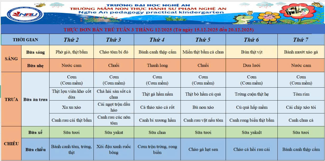 Nhà trường luôn chú trọng lựa chọn món ăn phù hợp với lứa tuổi mầm non, thay đổi linh hoạt theo ngày để bé ăn ngon miệng, khỏe mạnh và hứng khởi đến lớp. Kính mời Quý phụ huynh cùng theo dõi thực đơn trong tuần và đồng hành chăm sóc bữa ăn cho các con!