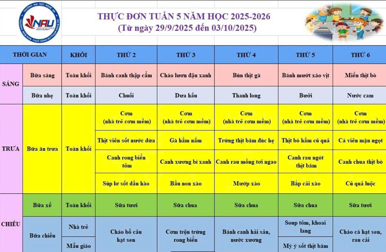 Trường Mầm non Thực hành Sư phạm Nghệ An xin gửi tới Quý phụ huynh thực đơn bán trú tuần 5 tháng 9/2025 (Từ ngày 29/9/2025 đến ngày 03/10/2025)