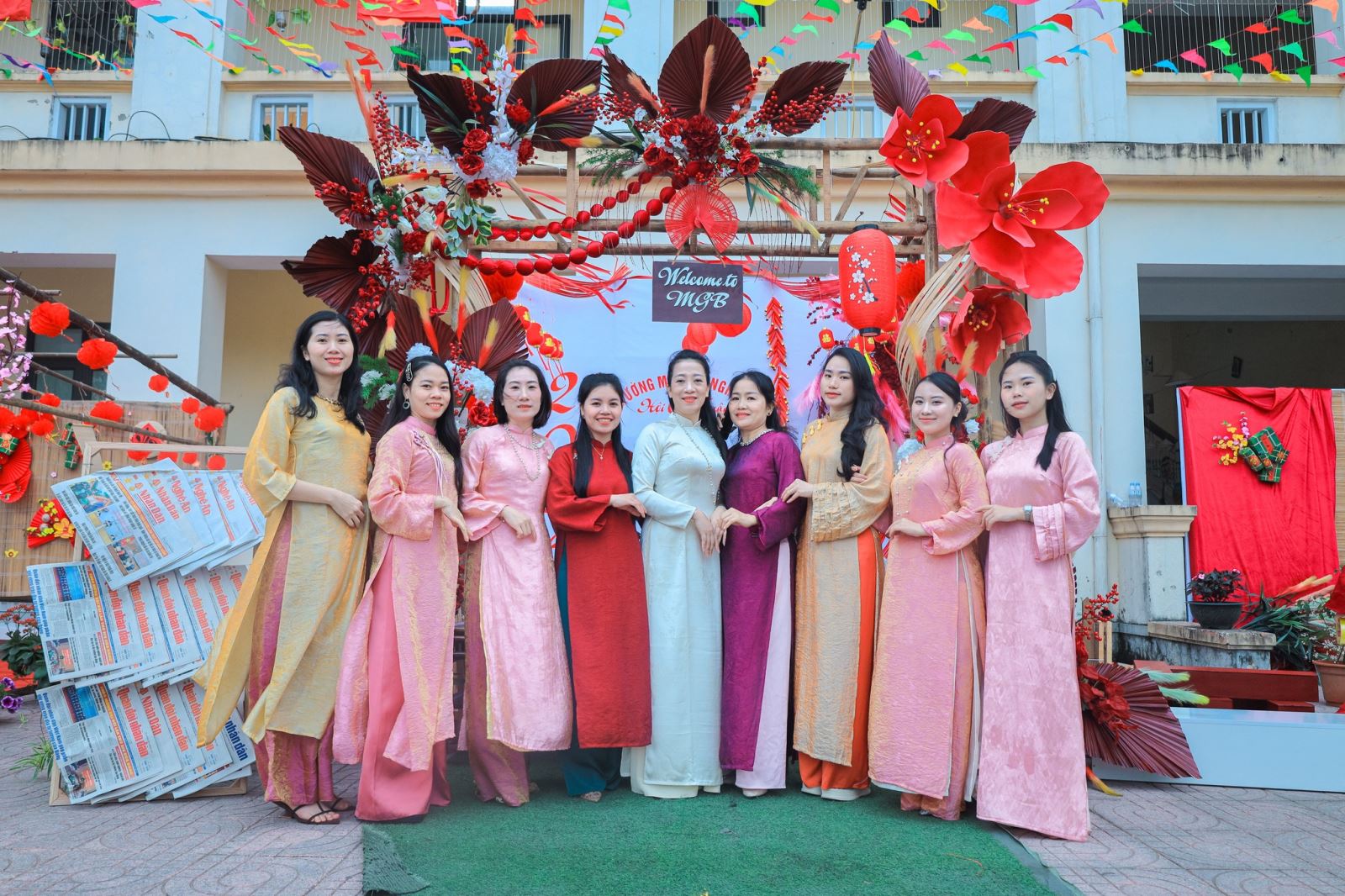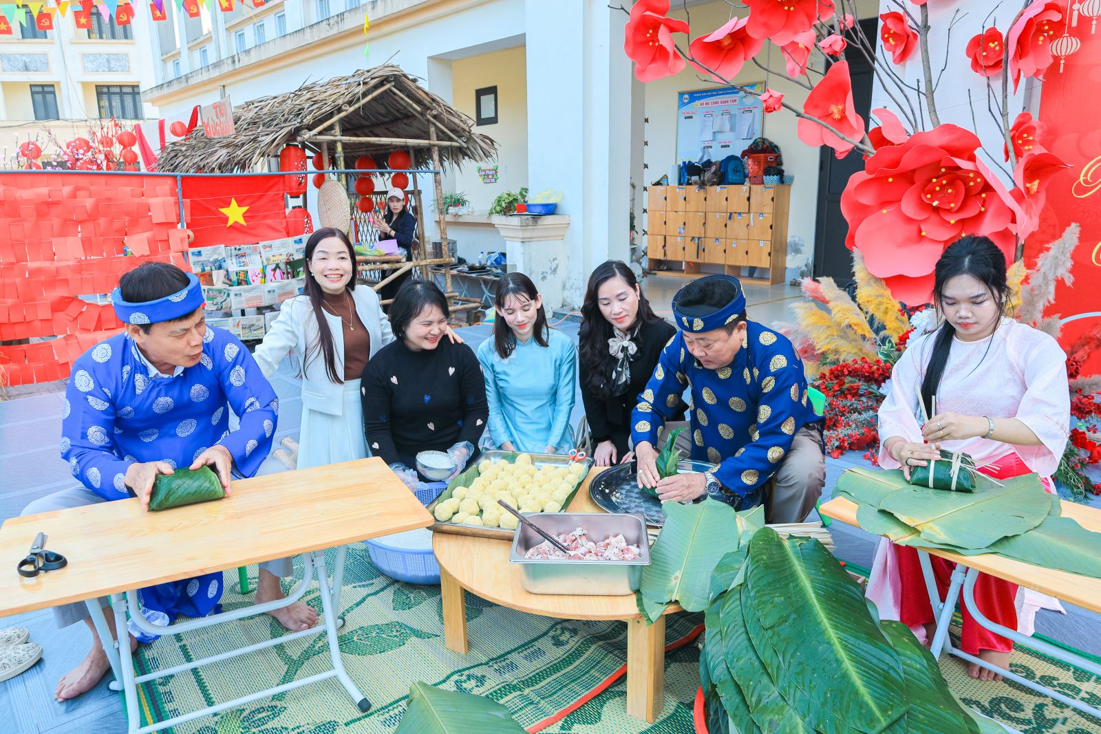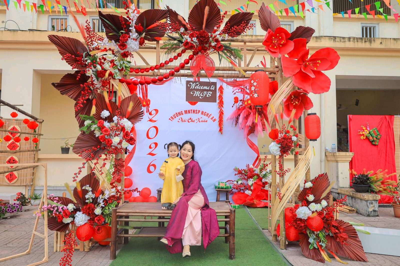 Ngay từ những khoảnh khắc đầu tiên, khuôn viên nhà trường đã khoác lên mình sắc xuân tươi mới với hoa đào, hoa mai, câu đối đỏ, gian hàng Tết truyền thống… Tất cả hòa quyện tạo nên một không gian Tết thân quen, gần gũi và đầy ắp niềm vui.