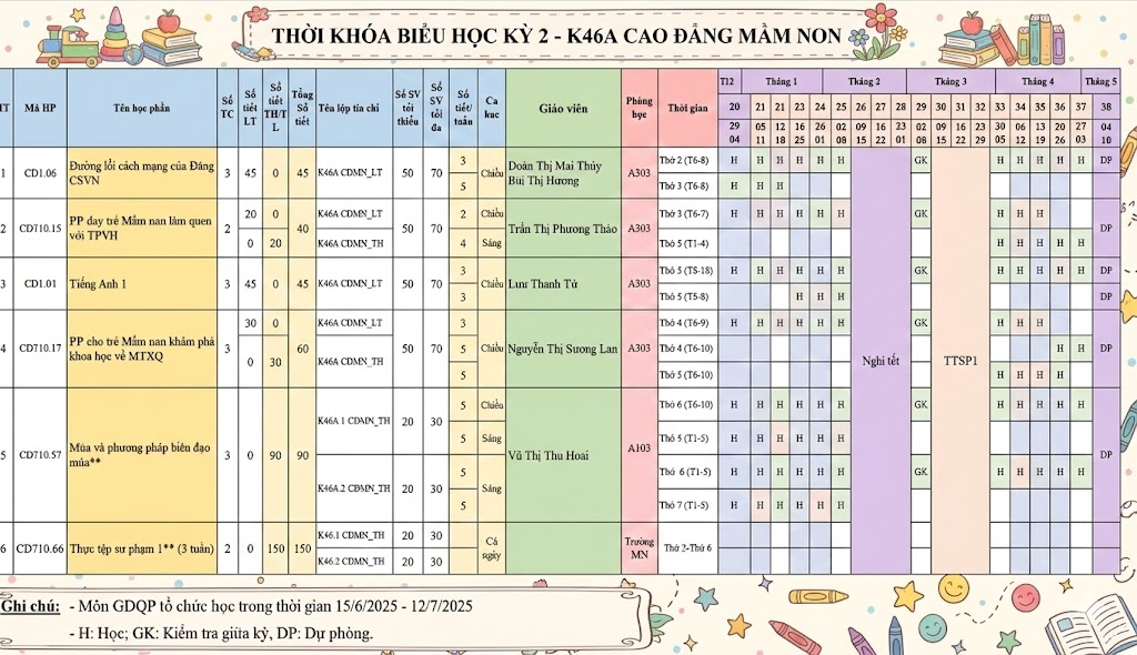 THỜI KHÓA BIỂU HỌC KỲ 2 - K46A CAO ĐẲNG MẦM NON 02/01/2026 06:53 314 lượt xem THỜI KHÓA BIỂU HỌC KỲ 2 - K46A CAO ĐẲNG MẦM NON