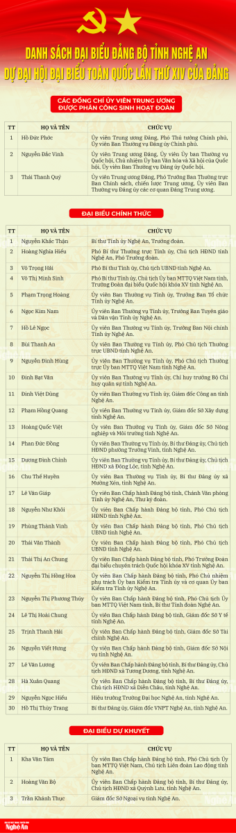 Đoàn đại biểu Đảng bộ tỉnh Nghệ An dự Đại hội đại biểu toàn quốc lần thứ XIV của Đảng gồm 33 đồng chí, do đồng chí Nguyễn Khắc Thận – Bí thư Tỉnh ủy làm Trưởng đoàn. Đại hội đại biểu toàn quốc lần thứ XIV của Đảng được tổ chức tại Thủ đô Hà Nội từ ngày 19 đến ngày 25/01/2026, với sự tham dự của 1.586 đại biểu, đại diện cho hơn 5,6 triệu đảng viên trong cả nước.