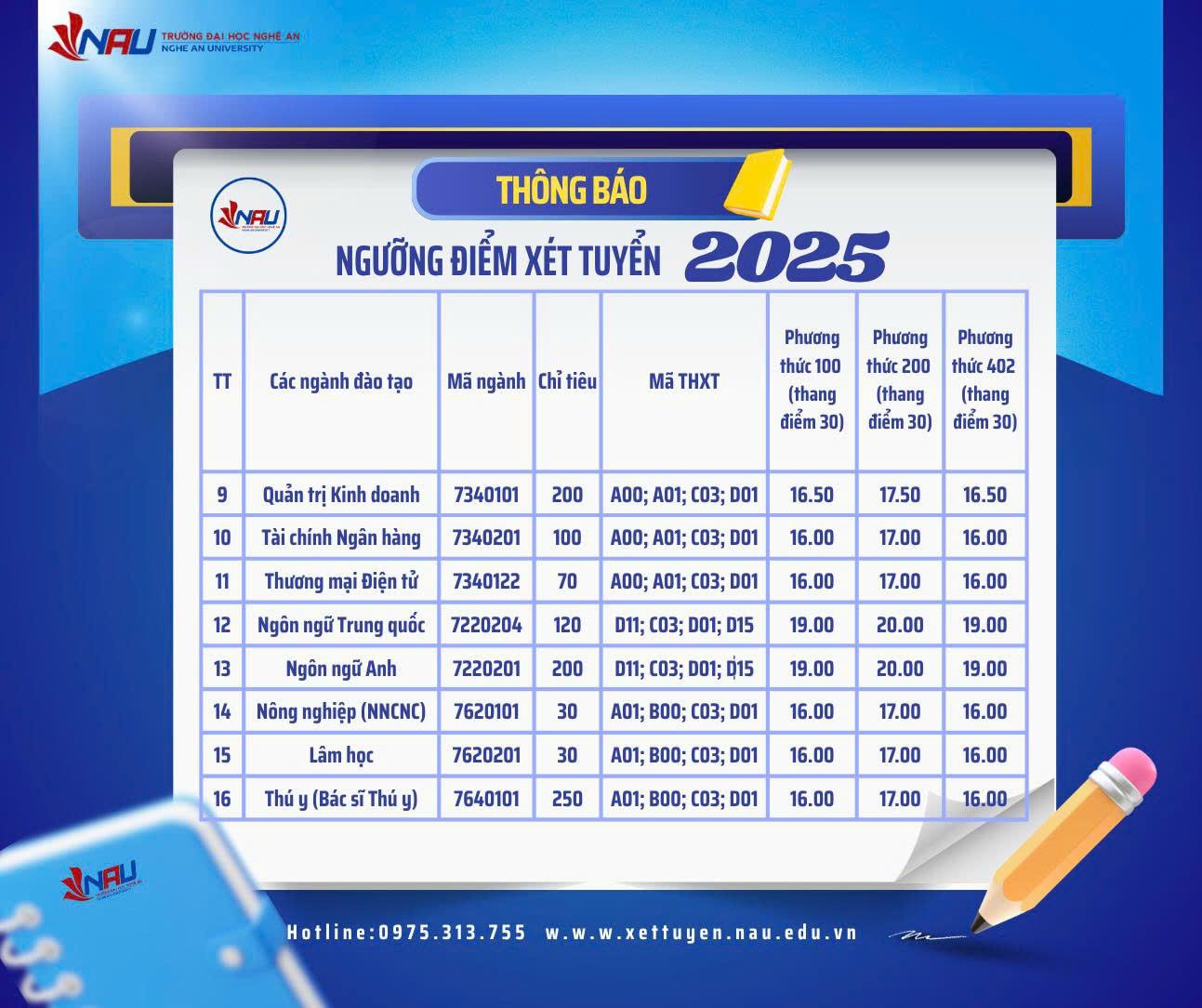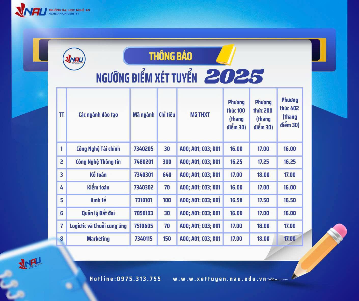 Hội đồng tuyển sinh Trường Đại học Nghệ An thông báo ngưỡng điểm xét tuyển đầu vào đối với các phương thức xét tuyển đại học chính quy năm 2025 như sau: