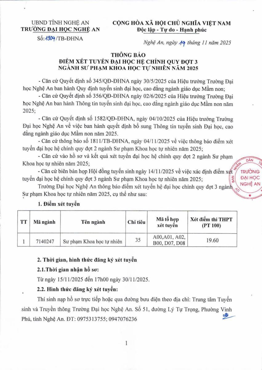Trường Đại học Nghệ An trân trọng thông báo tuyển sinh bổ sung đợt 3 hệ đại học chính quy ngành Sư phạm Khoa học Tự nhiên.