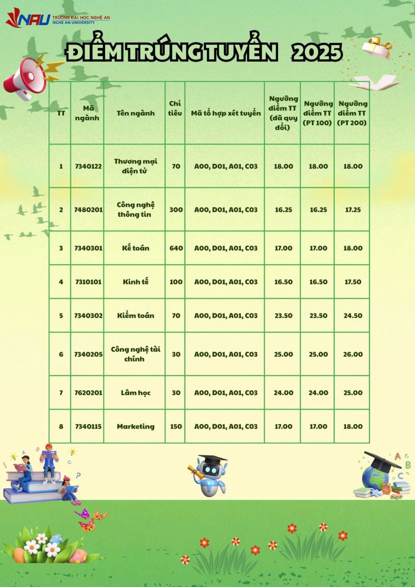 Trường Đại học Nghệ An (NAU) thông báo điểm trúng tuyển vào Đại học chính quy đợt 1 năm 2025 như sau: