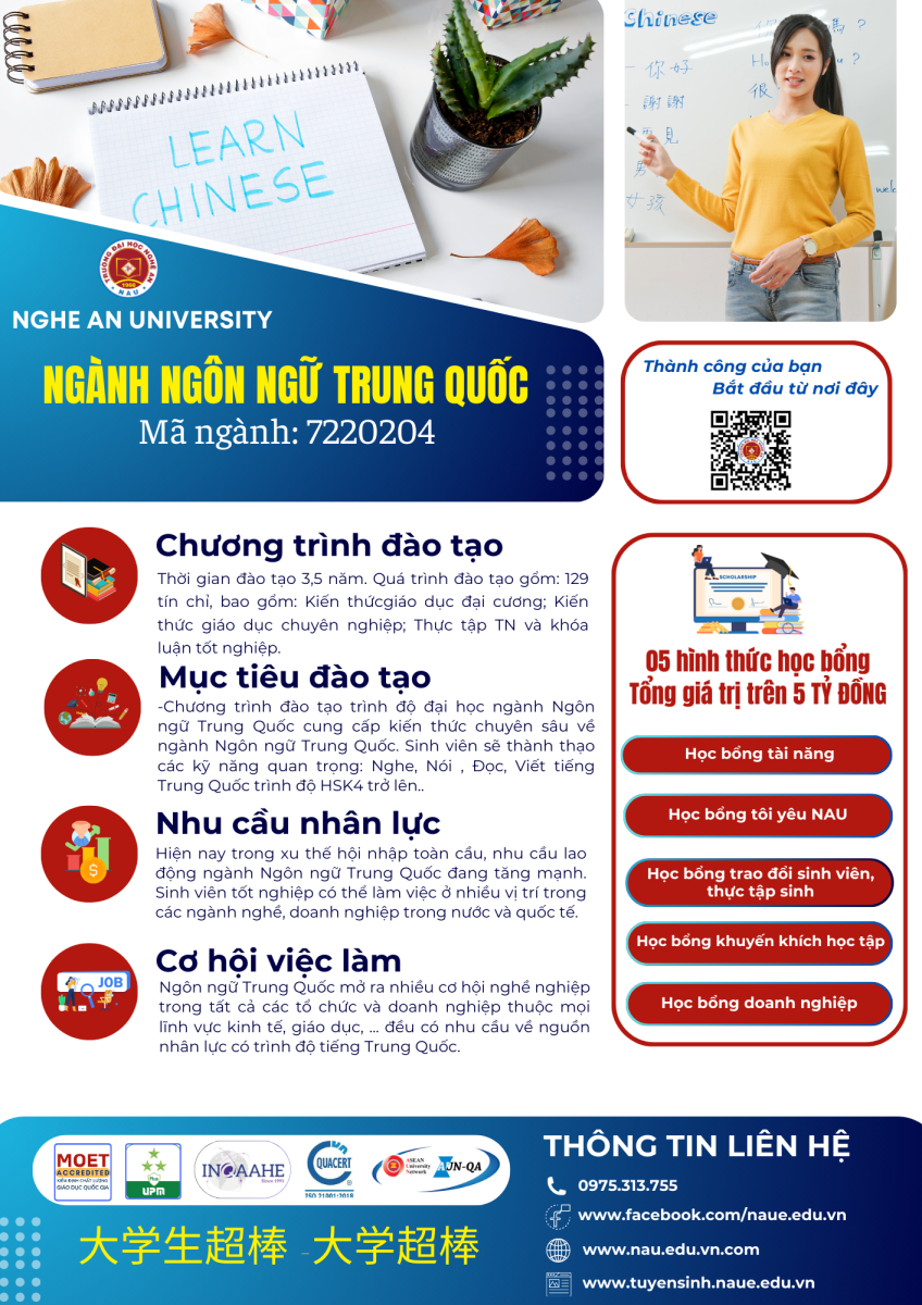 Năm 2025, Trường Đại học Nghệ An tuyển sinh 70 chỉ tiêu ngành Ngôn ngữ Trung với 4 phương thức xét tuyển: