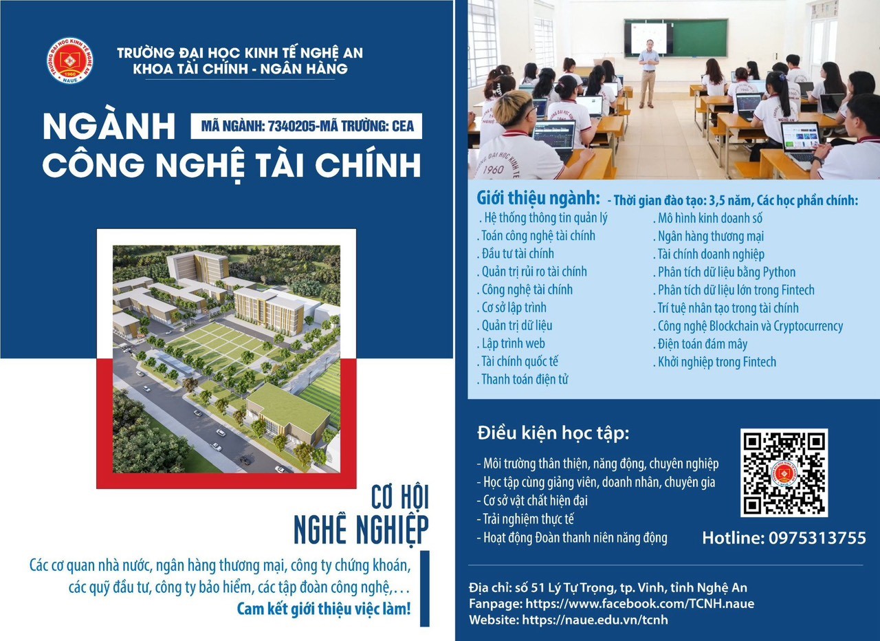 Việc học và nghiên cứu ngành Công nghệ tài chính tại Trường Đại học Kinh tế Nghệ An sẽ mở ra nhiều cơ hội nghề nghiệp trong lĩnh vực đang phát triển này. Sinh viên sẽ được tiếp cận với các kiến thức về tài chính, công nghệ thông tin, quản lý dữ liệu, và các kỹ năng cần thiết để làm việc trong môi trường tài chính hiện đại. Đừng bỏ lỡ cơ hội trở thành chuyên gia Fintech trong tương lai. Đăng ký ngay hôm nay!