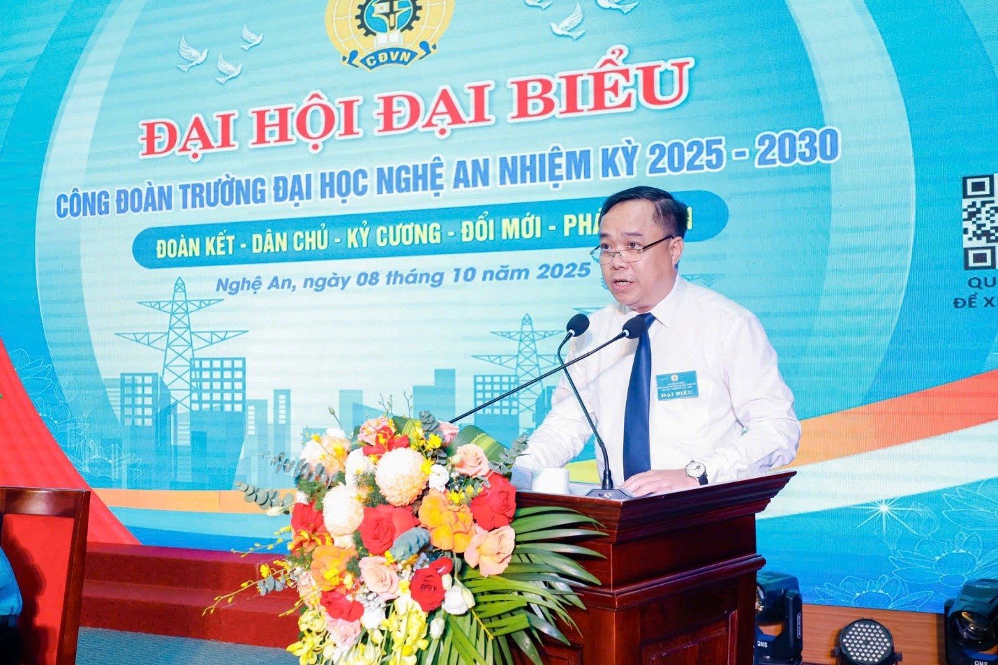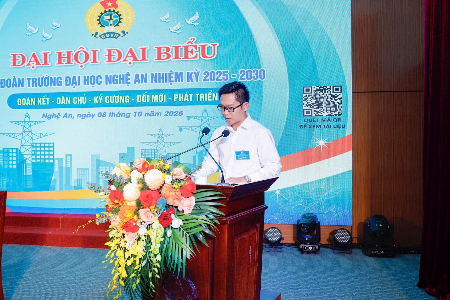 Chiều ngày 08 tháng 10 năm 2025, tại Hội trường A1 Trường Đại học Nghệ An, Công đoàn Trường đã long trọng tổ chức Đại hội Công đoàn Trường Đại học Nghệ An lần thứ I, nhiệm kỳ 2025 – 2030. Đây là sự kiện chính trị quan trọng, đánh dấu bước phát triển mới của tổ chức công đoàn trong bối cảnh sau sáp nhập, khẳng định tinh thần “Đoàn kết – Dân chủ - Kỷ cương – Đổi mới – Phát triển” của tập thể viên chức, người lao động toàn trường