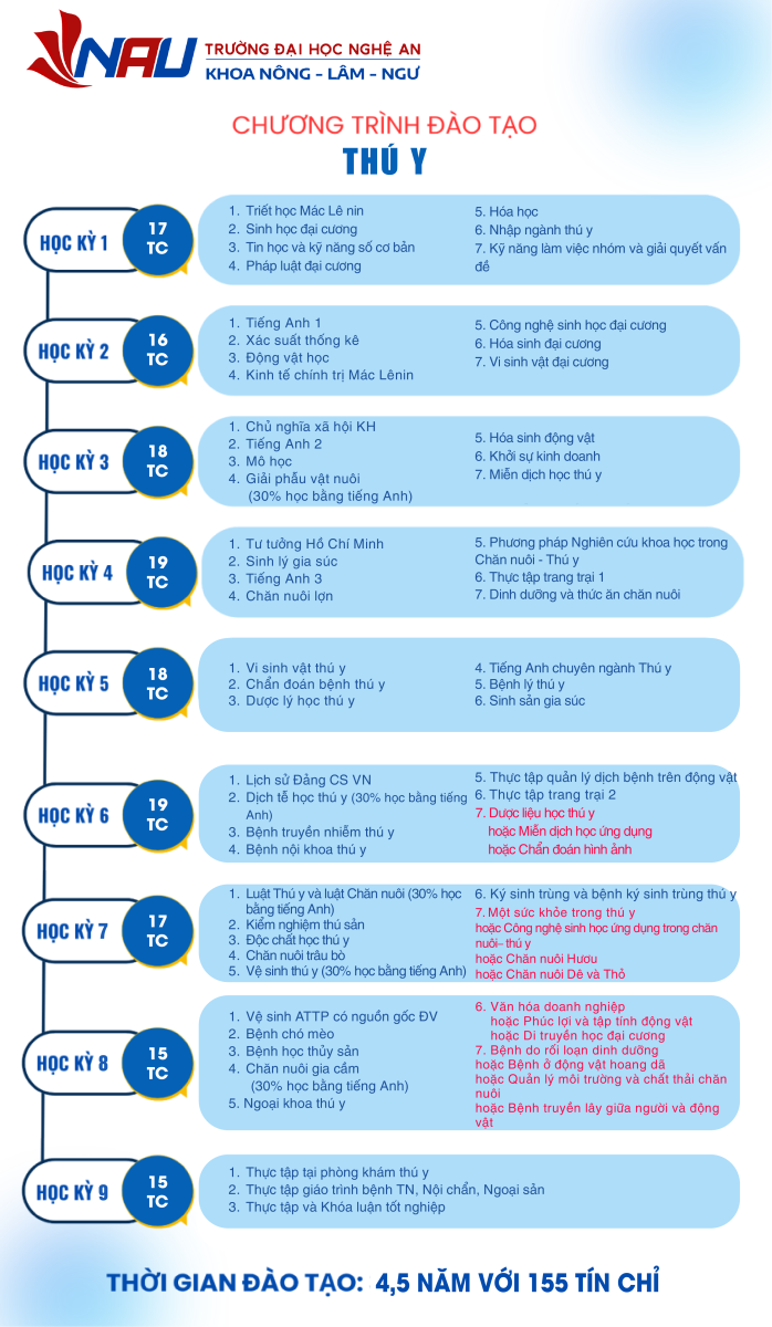 Ngành Thú y - mã ngành 7640101 - tại Trường Đại học Nghệ An là một trong những ngành đào tạo mũi nhọn, cung cấp nguồn nhân lực chất lượng cao cho lĩnh vực nông nghiệp công nghệ cao và sức khỏe động vật. Chương trình được thiết kế theo chuẩn năng lực nghề nghiệp của Tổ chức Thú y Thế giới (WOAH/OIE), tham chiếu chương trình của các trường thú y trong khu vực châu Á - Đông Nam Á, và bám sát thực tiễn ngành chăn nuôi, thú y tại Việt Nam.