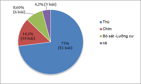 Kết quả điều tra phỏng vấn và khảo sát thực địa cho thấy tổng cộng 70 loài ĐVHD đã được săn bắt phổ biến tại các hộ gia đình, gồm có 51 loài thú chiếm khoảng 73 %, 10 loài chim chiếm khoảng 14,2 %, 6 loài bò sát và lưỡng cư chiếm khoảng 8,6 % và 3 loài cá chiếm khoảng 4,2 % (hình 1).