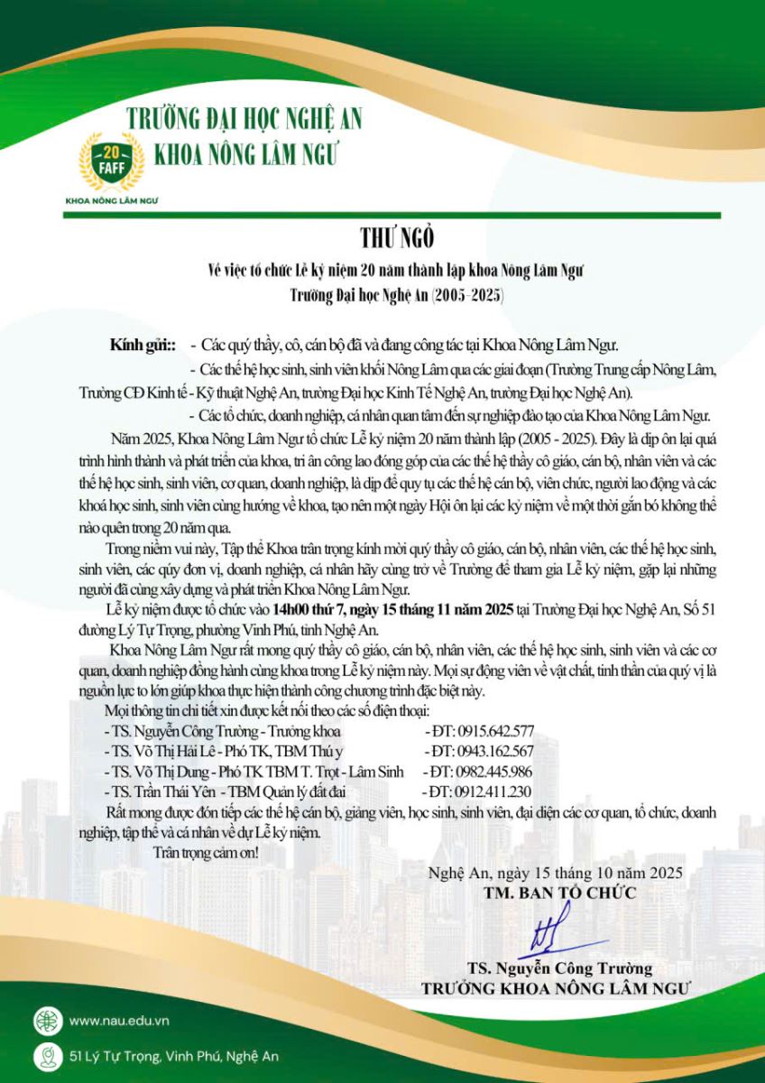 Thư ngỏ về việc tổ chức lễ kỷ niệm 20 năm thành lập khoa Nông Lâm Ngư, trường Đại học Nghệ An 20/10/2025 09:30 817 lượt xem