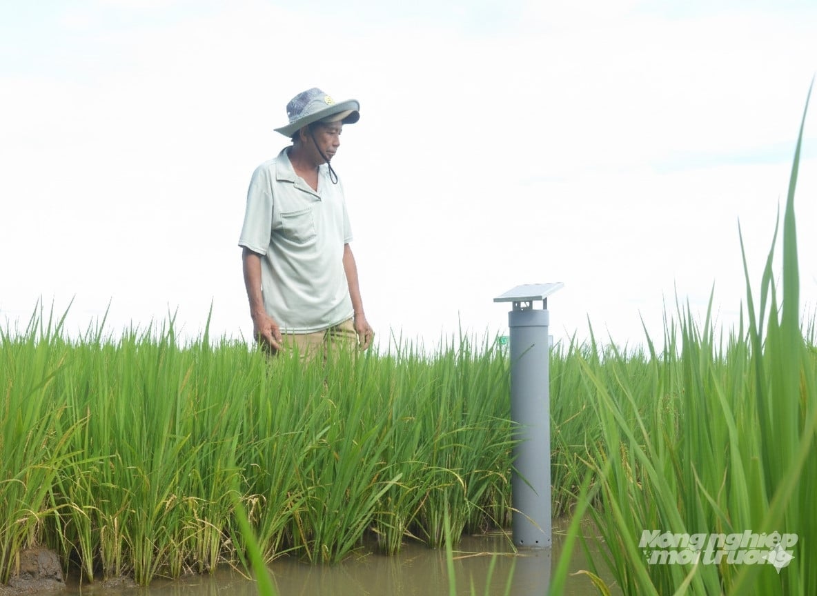 Nhiều cánh đồng tại An Giang còn được trang bị hệ thống tưới thông minh theo kỹ thuật ngập - khô xen kẽ (AWD), ruộng lúa được theo dõi mực nước, độ ẩm… thông qua cảm biến. Khi ruộng đủ khô theo ngưỡng định sẵn, máy bơm sẽ tự động được kích hoạt, tránh tưới ngập thường xuyên.