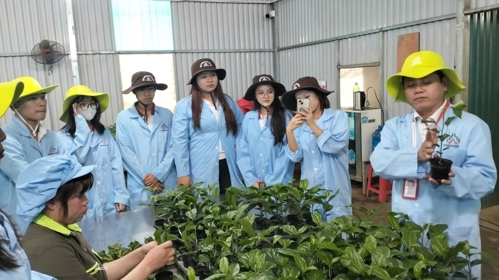 Sau chương trình làm việc tại nhà máy, đoàn tiếp tục tham quan các khu vực sản xuất giống và vùng trồng nguyên liệu của Nafoods. Sinh viên được tìm hiểu quy trình gieo hạt tạo cây gốc ghép, thăm nhà chăm sóc cây con, nhà trồng và chăm sóc cây đầu dòng – những khâu nền tảng quyết định chất lượng giống. Đặc biệt, đoàn được quan sát trực tiếp quy trình nhân giống bằng phương pháp ghép, kỹ thuật chăm sóc cây sau ghép và quy trình đóng thùng cây con để vận chuyển đến vùng sản xuất. Đây là những bước kỹ thuật quan trọng, đòi hỏi trình độ chuyên môn cao và là nội dung cốt lõi trong đào tạo ngành Nông nghiệp công nghệ cao.