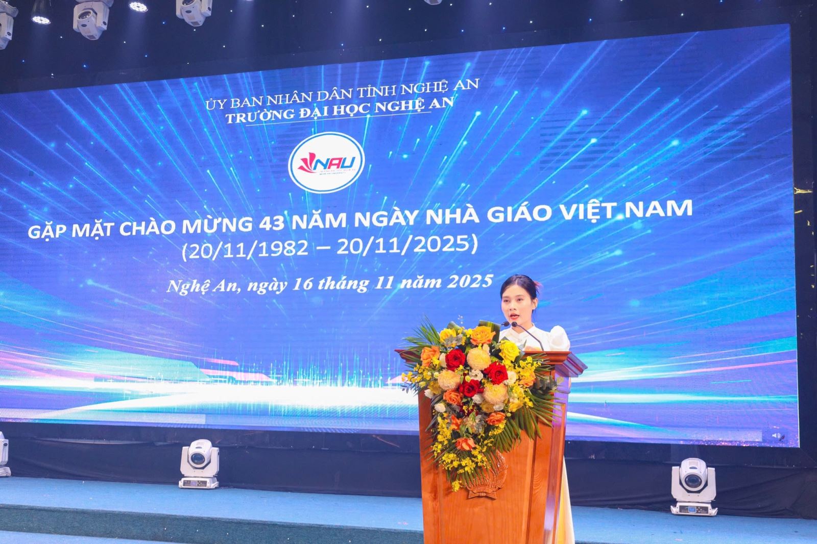 Em là Nguyễn Thuý Hiền, sinh viên lớp Marketing K10. Hôm nay, trong không khí rộn ràng và trang trọng của buổi lễ kỷ niệm Ngày Nhà giáo Việt Nam 20 tháng 11, em vô cùng vinh dự được thay mặt cho toàn thể sinh viên Trường Đại học Nghệ An gửi tới quý thầy cô những lời chúc mừng nồng nhiệt, lời tri ân sâu sắc và tình cảm biết ơn chân thành nhất.