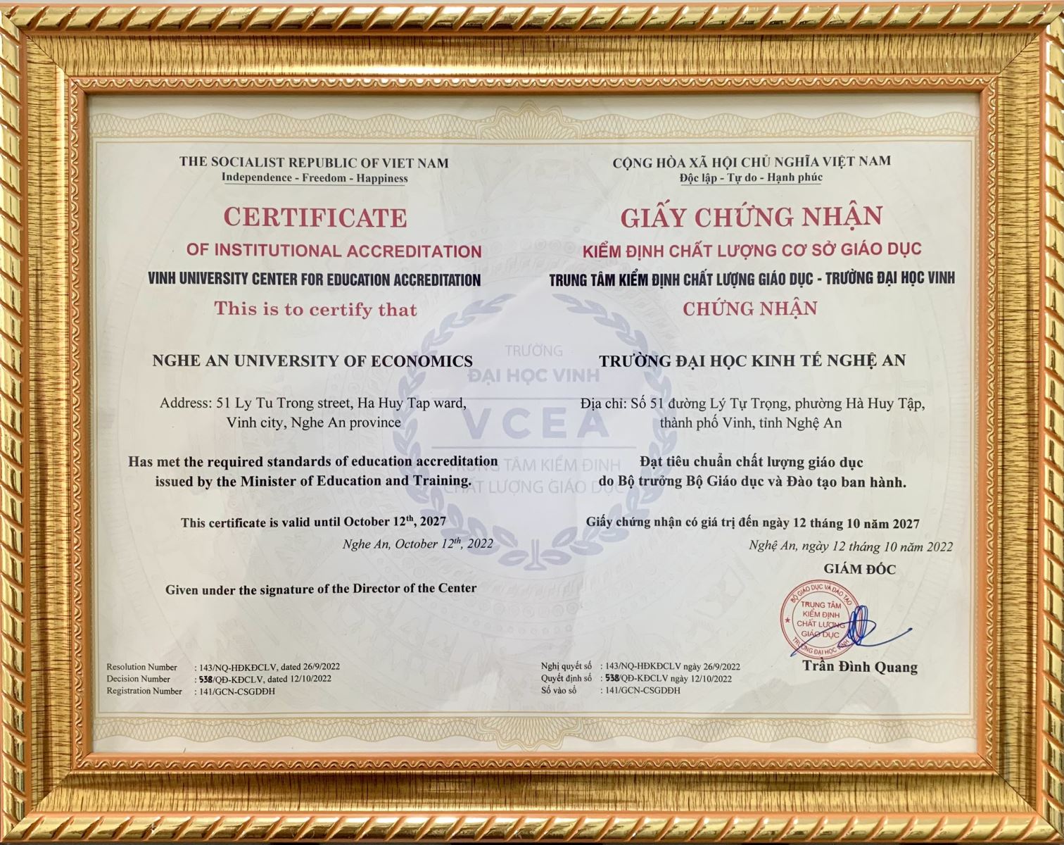 Ngày 14/10/2022, Trường Đại học Kinh tế Nghệ An diễn ra Lễ công bố và đón nhận chứng nhận kiểm định chất lượng cơ sở giáo dục theo quy định tại Thông tư 12/2017/TT-BGDĐT ngày 19/5/2017của Bộ Giáo dục và Đào tạo.