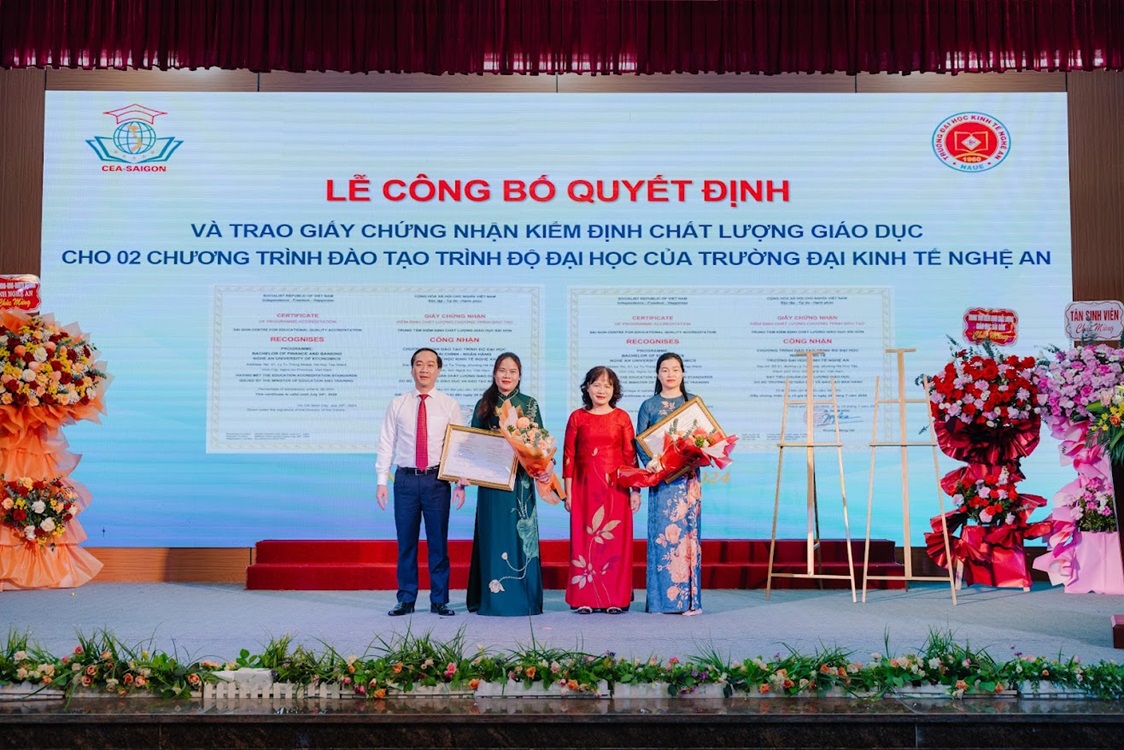 Trong buổi Lễ khai giảng nay, Trường Đại học Kinh tế Nghệ A vinh dự đón nhận Giấy chứng nhận kiểm định chất lượng CTĐT cho ngành Tài chính ngân hàng và ngành Kinh tế.