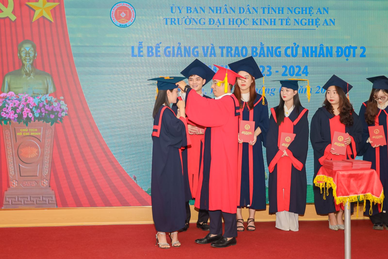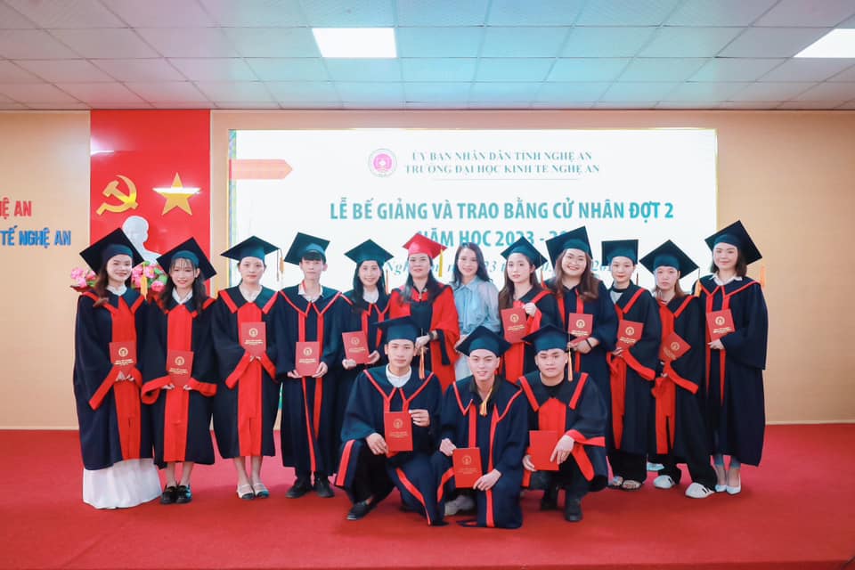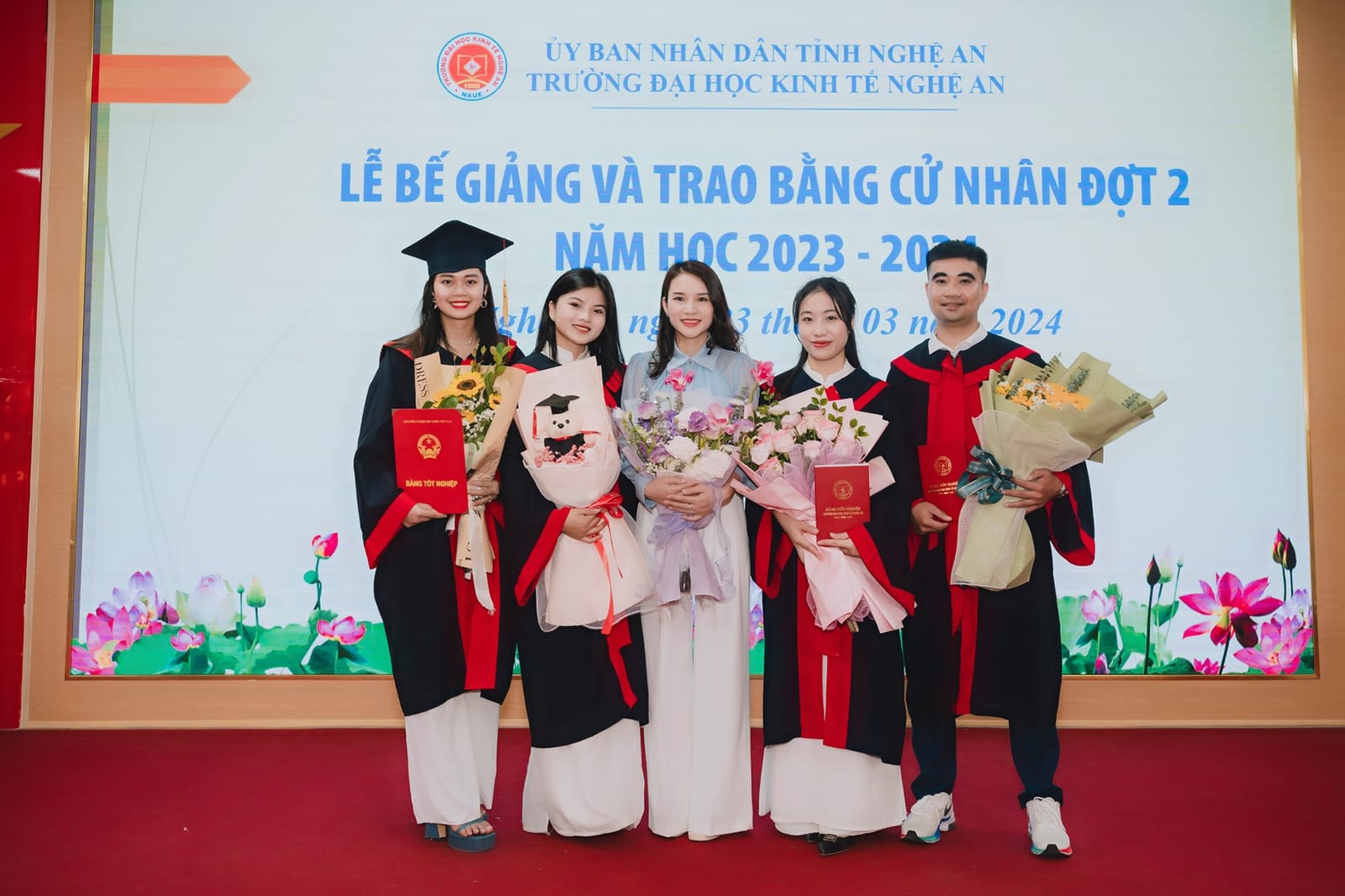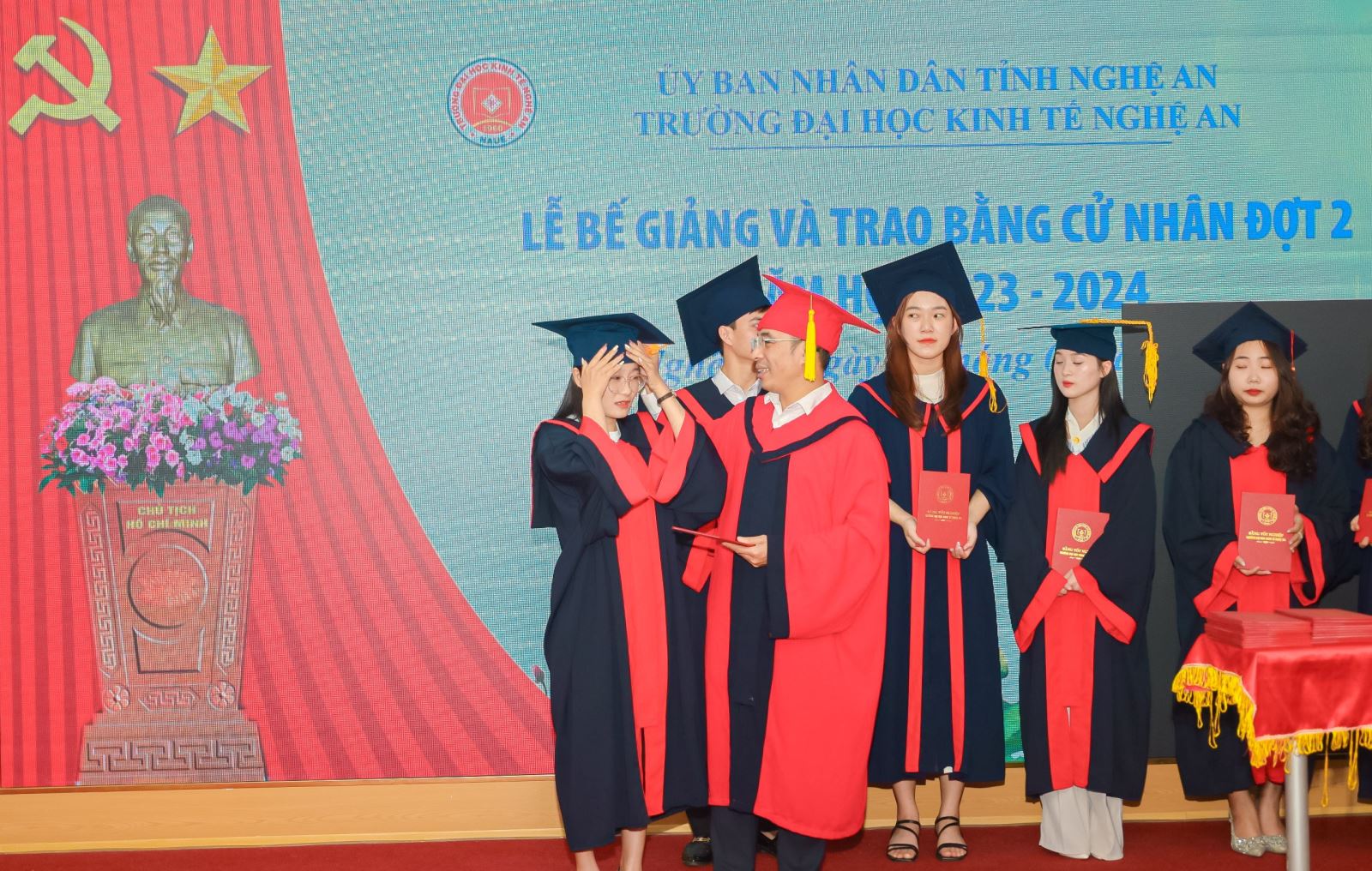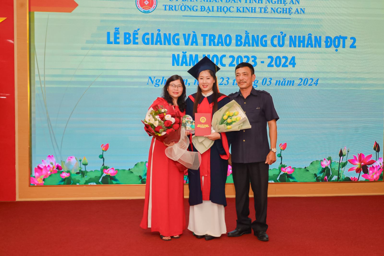 Hơn 200 tân Cử nhân đã chính thức nói lời chia tay với mái Trường Đại học Kinh tế Nghệ An. Dẫu vậy, hình ảnh về một Lễ tốt nghiệp trang trọng; lời dặn dò chân tình của lãnh đạo nhà trường; chia sẻ sâu sắc của những người thành công; sự chăm lo chu đáo của các cán bộ, giảng viên, nhân viên nhà trường đã mang đến nụ cười và những giọt nước mắt hạnh phúc cho các tân khoa trong buổi lễ nhận bằng tốt nghiệp.