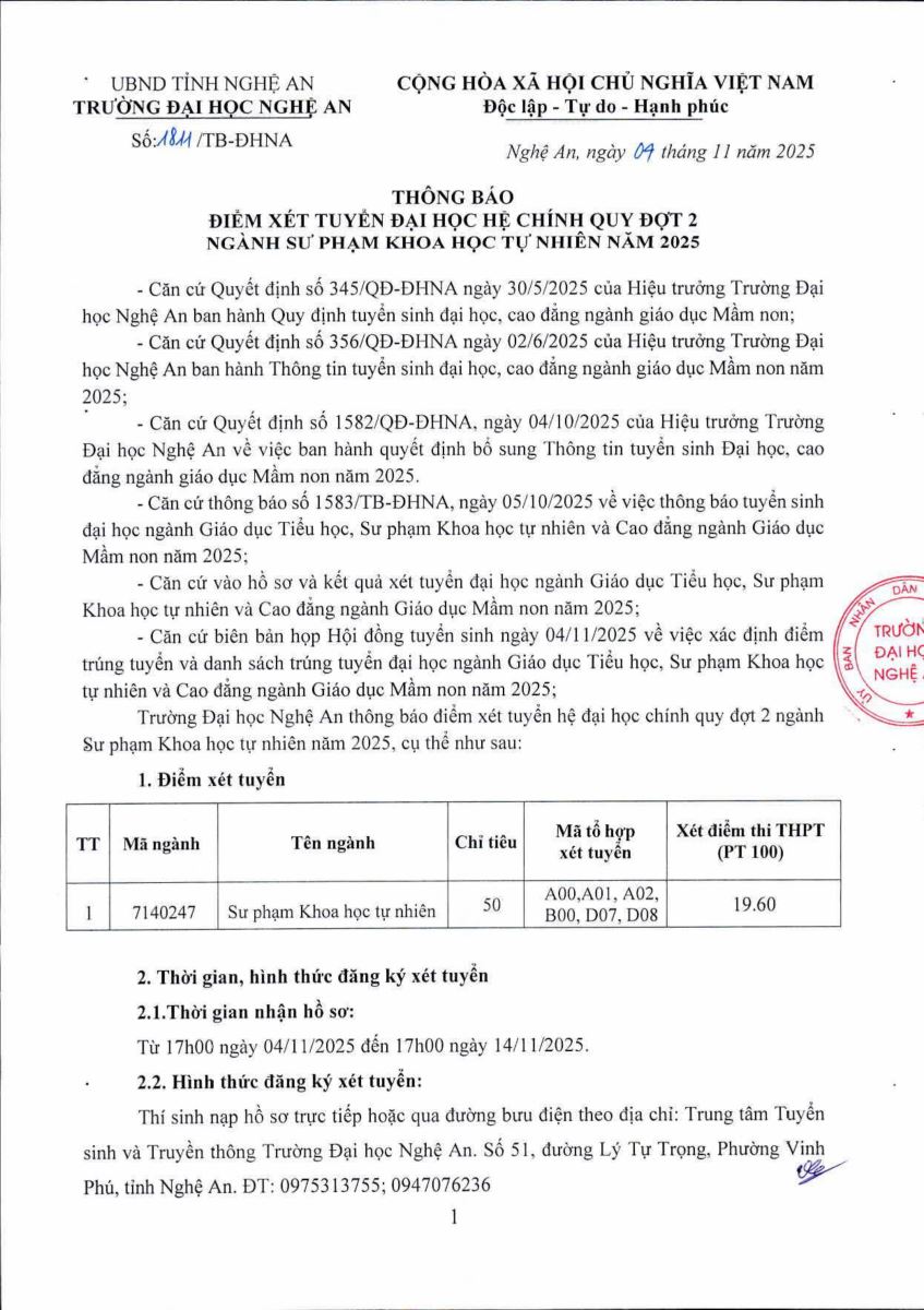 Thông báo tuyển sinh đại học chính quy đợt 2 ngành Sư phạm Khoa học tự nhiên 05/11/2025 03:05 274 lượt xem Trường Đại học Nghệ An thông báo tuyển sinh đại học chính quy đợt 2 ngành Sư phạm Khoa học Tự nhiên năm 2025, cụ thể như sau: